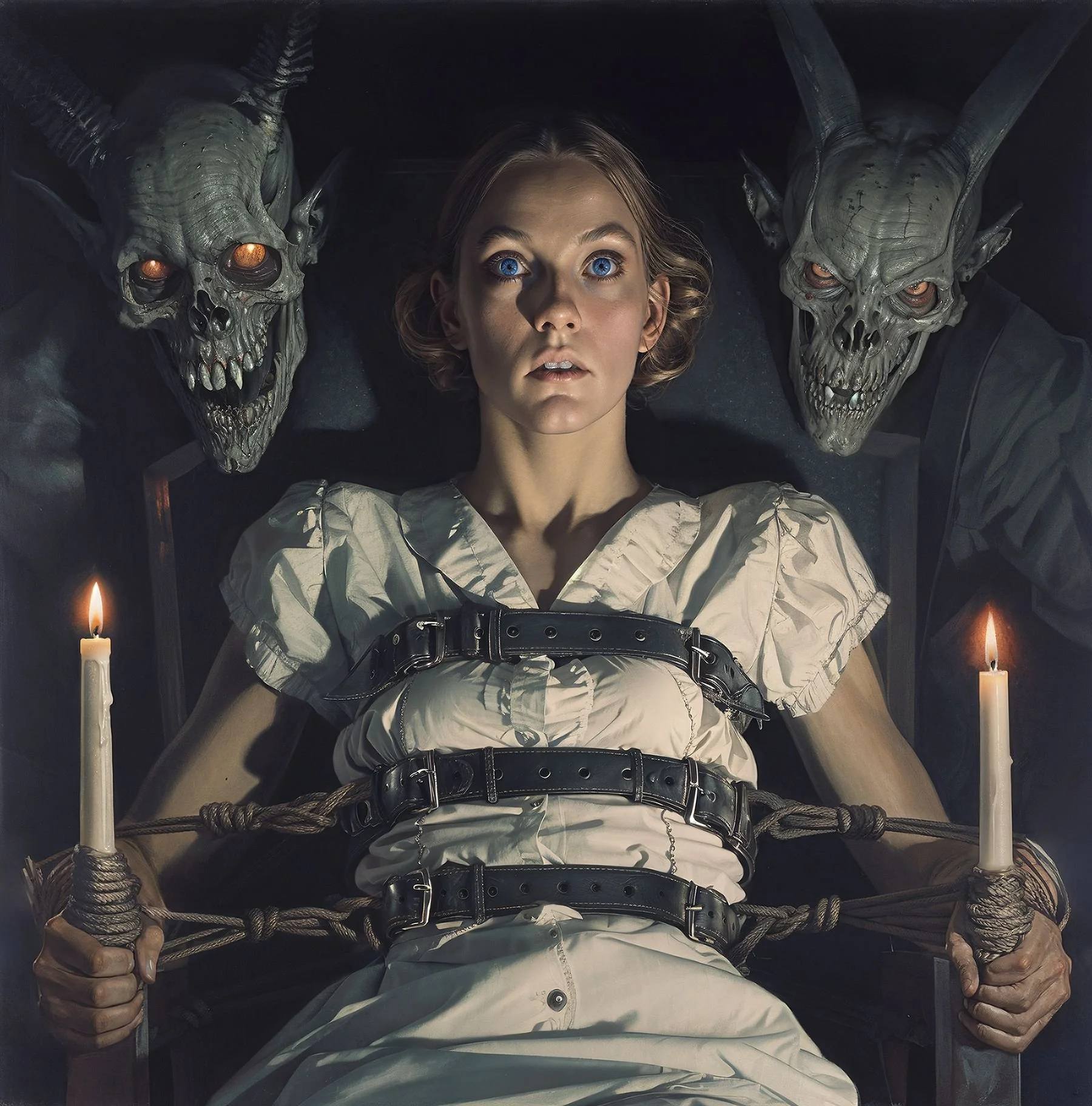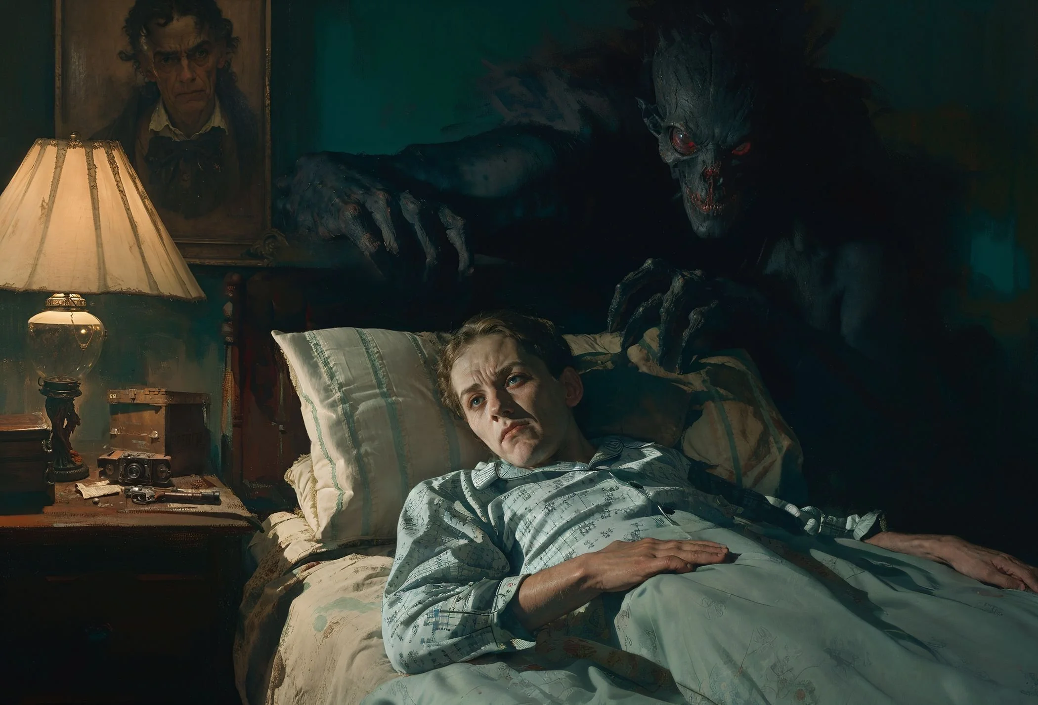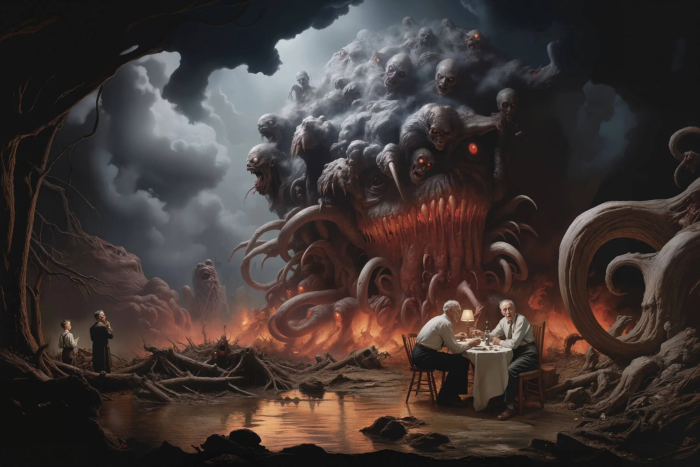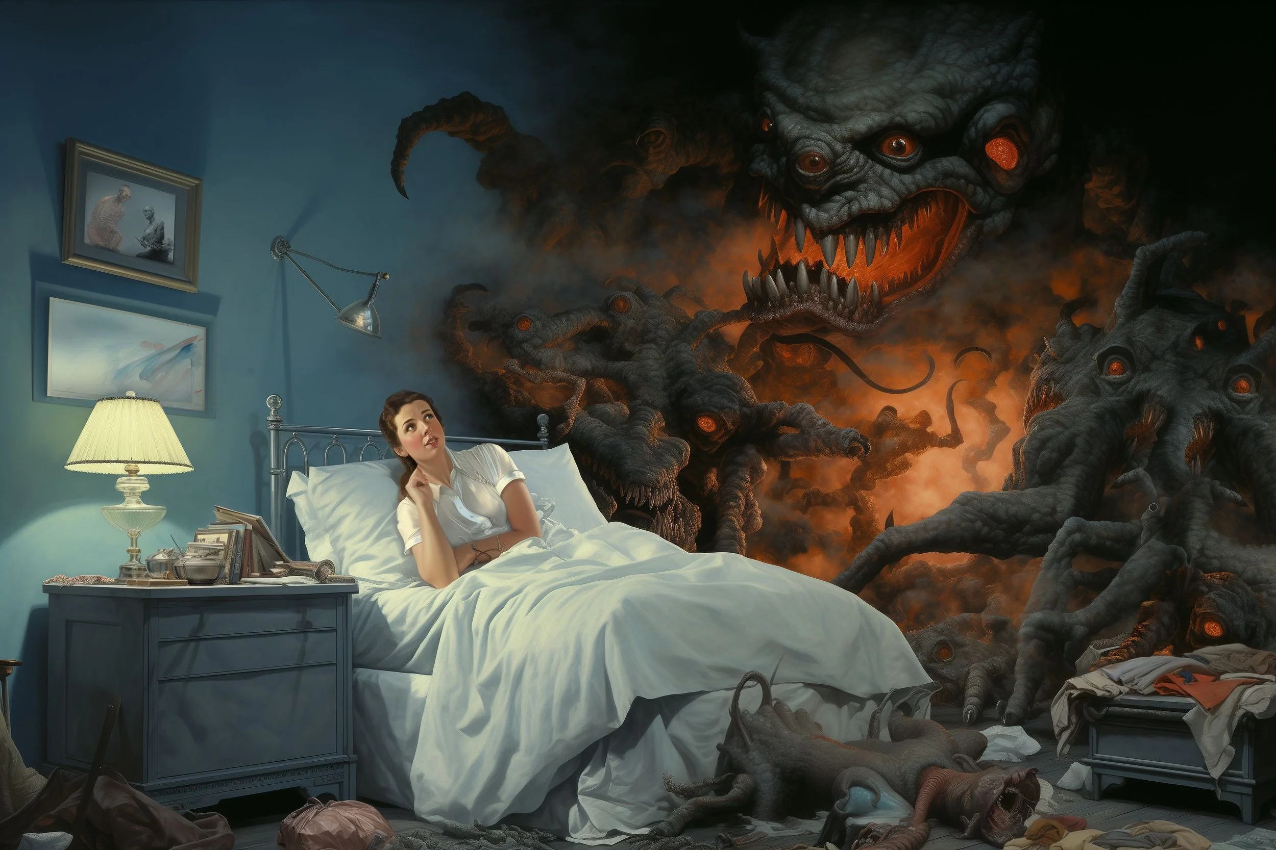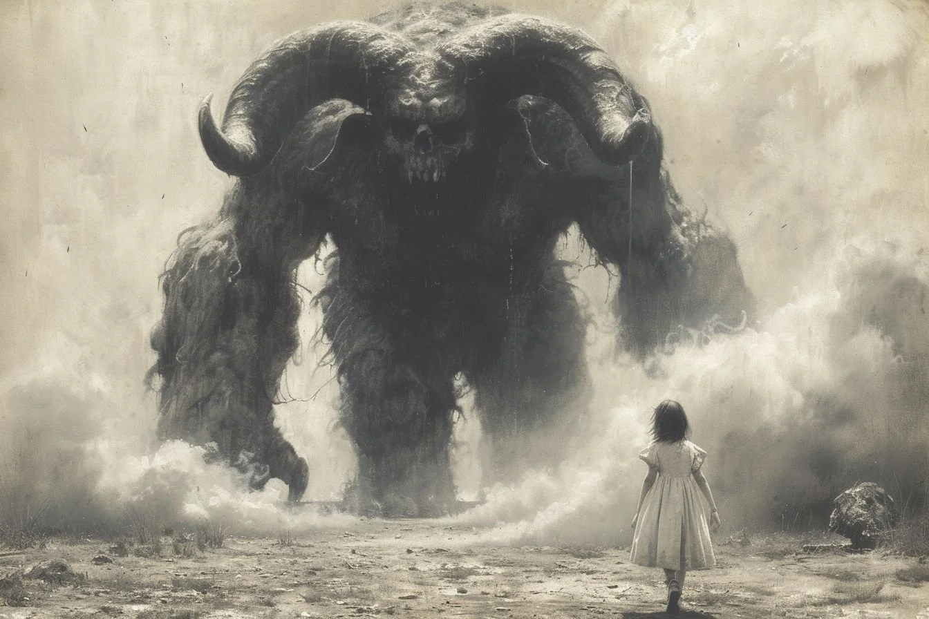 BlinD Imagery’s execution is nothing short of astonishing. His pieces are rendered with extreme precision and clarity, creating high-resolution works that seem to come to life on screen. Whether human or monstrous, his subjects—often eerie, grotesque, and fearsome—are lit in unparalleled ways. His creatures and demons are at times well-defined, as if illuminated by an elusive spotlight off-screen, or they simply emerge from the shadows, haunting and ambiguous. Fearsome, they stand alongside or entrap their human subjects with an intensity that is both terrifying and breathtaking, looming ominously over men, women, and children alike. For me, some of his art evokes the sensation of viewing nightmarish content through a vintage Stereoscope View-Master, but in the sharpest, highest definition imaginable.