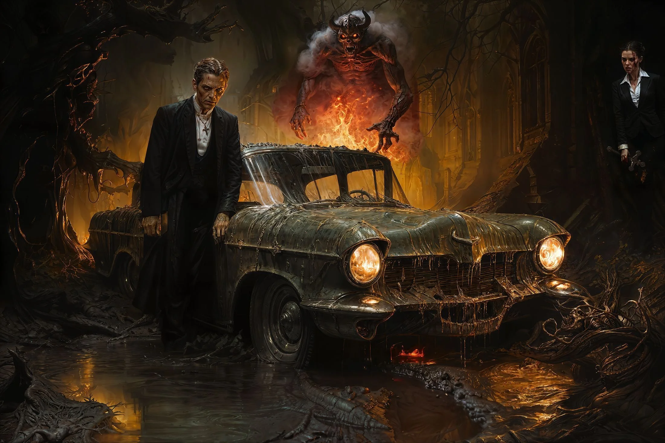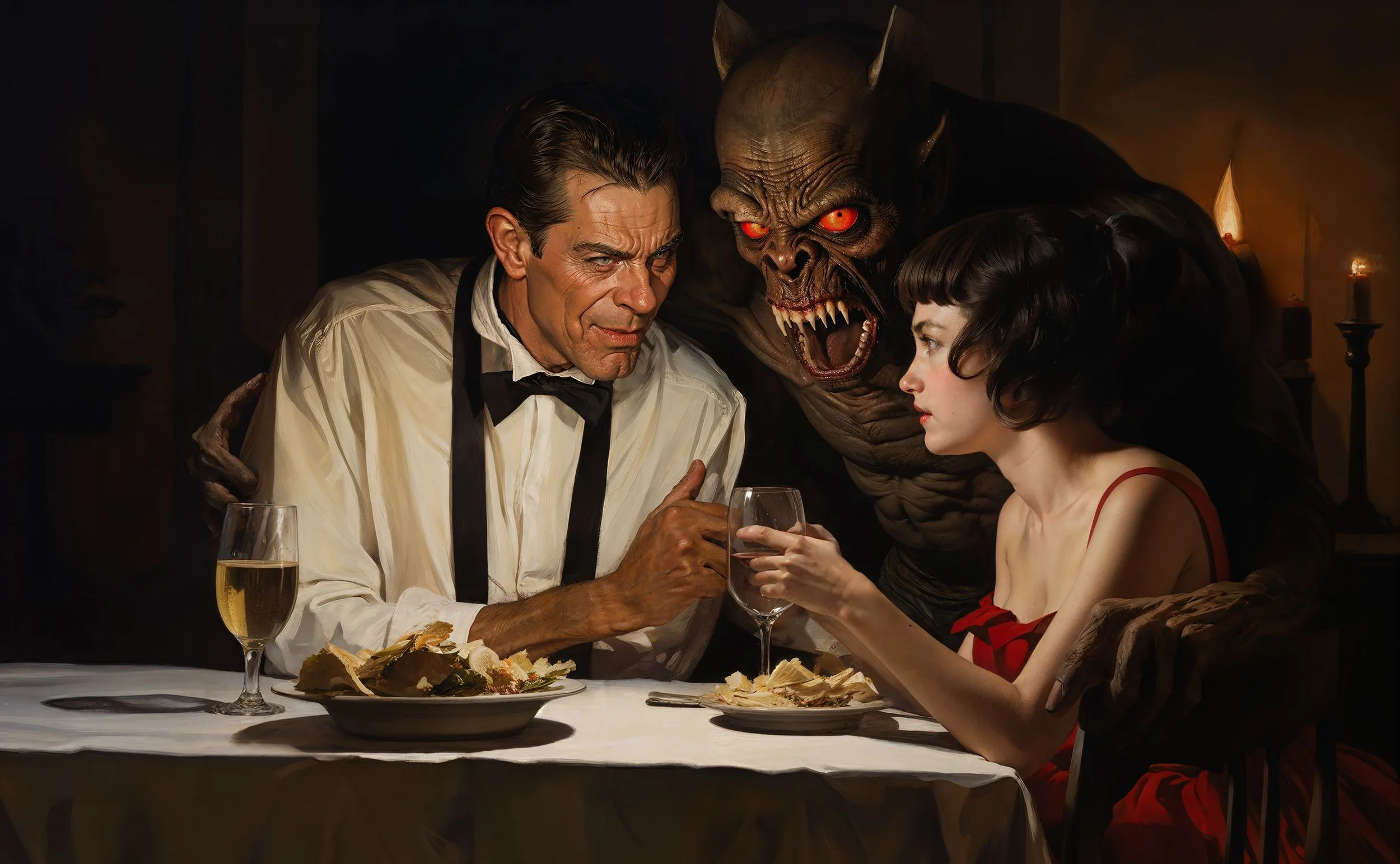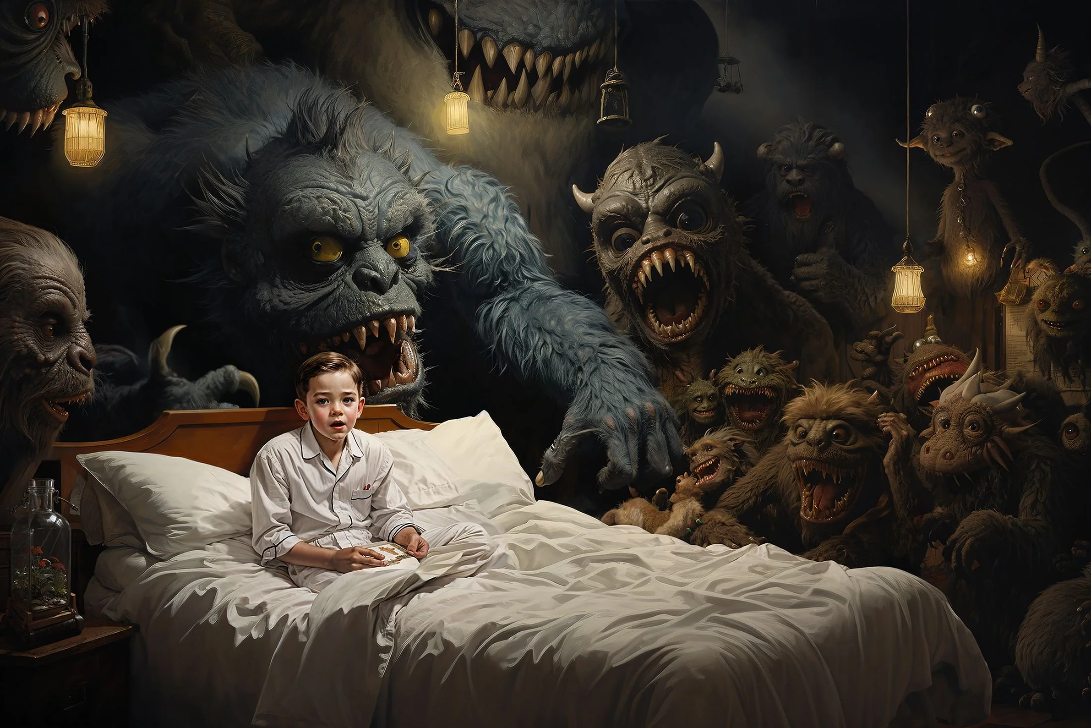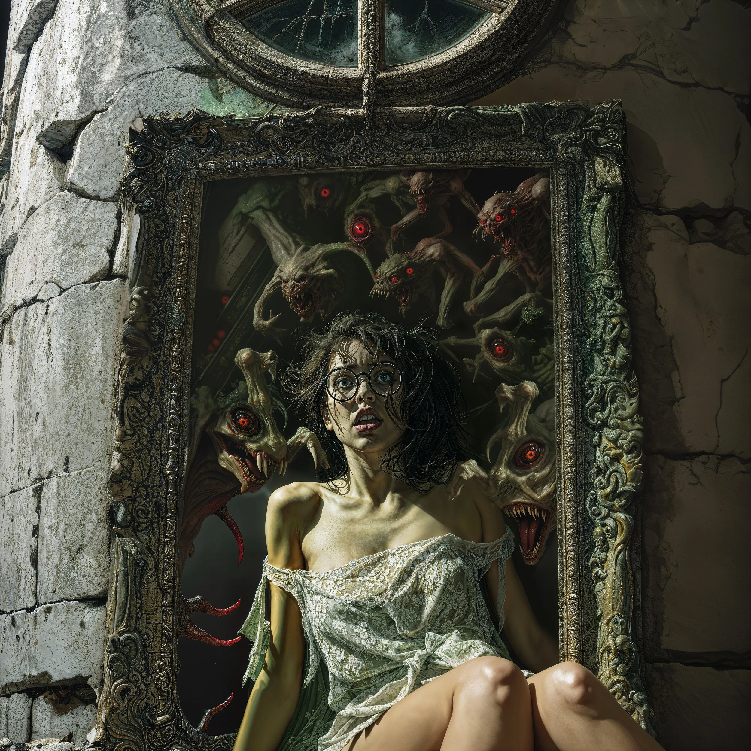 BlinD Imagery’s execution is nothing short of astonishing. His pieces are rendered with extreme precision and clarity, creating high-resolution works that seem to come to life on screen. Whether human or monstrous, his subjects—often eerie, grotesque, and fearsome—are lit in unparalleled ways. His creatures and demons are at times well-defined, as if illuminated by an elusive spotlight off-screen, or they simply emerge from the shadows, haunting and ambiguous. Fearsome, they stand alongside or entrap their human subjects with an intensity that is both terrifying and breathtaking, looming ominously over men, women, and children alike. For me, some of his art evokes the sensation of viewing nightmarish content through a vintage Stereoscope View-Master, but in the sharpest, highest definition imaginable.