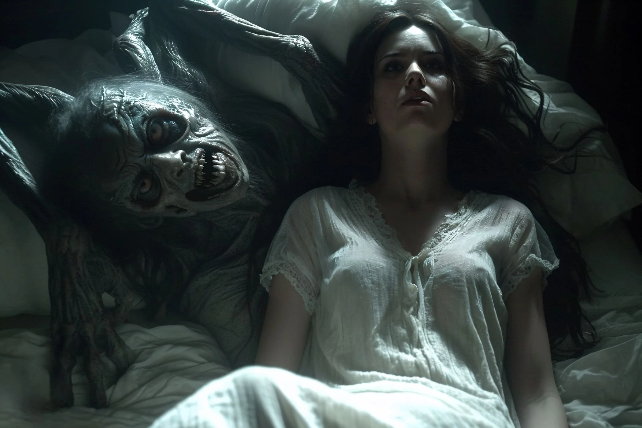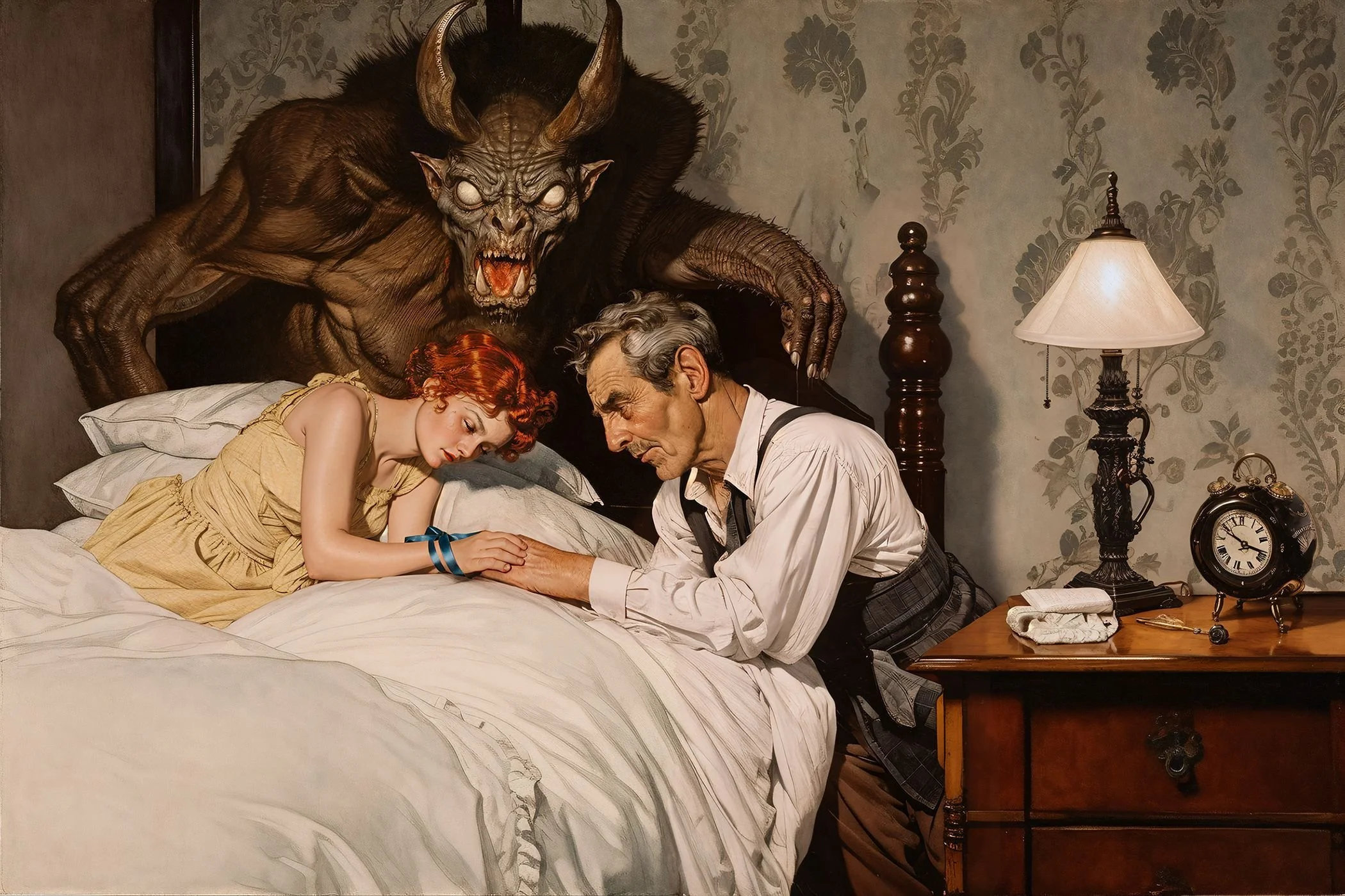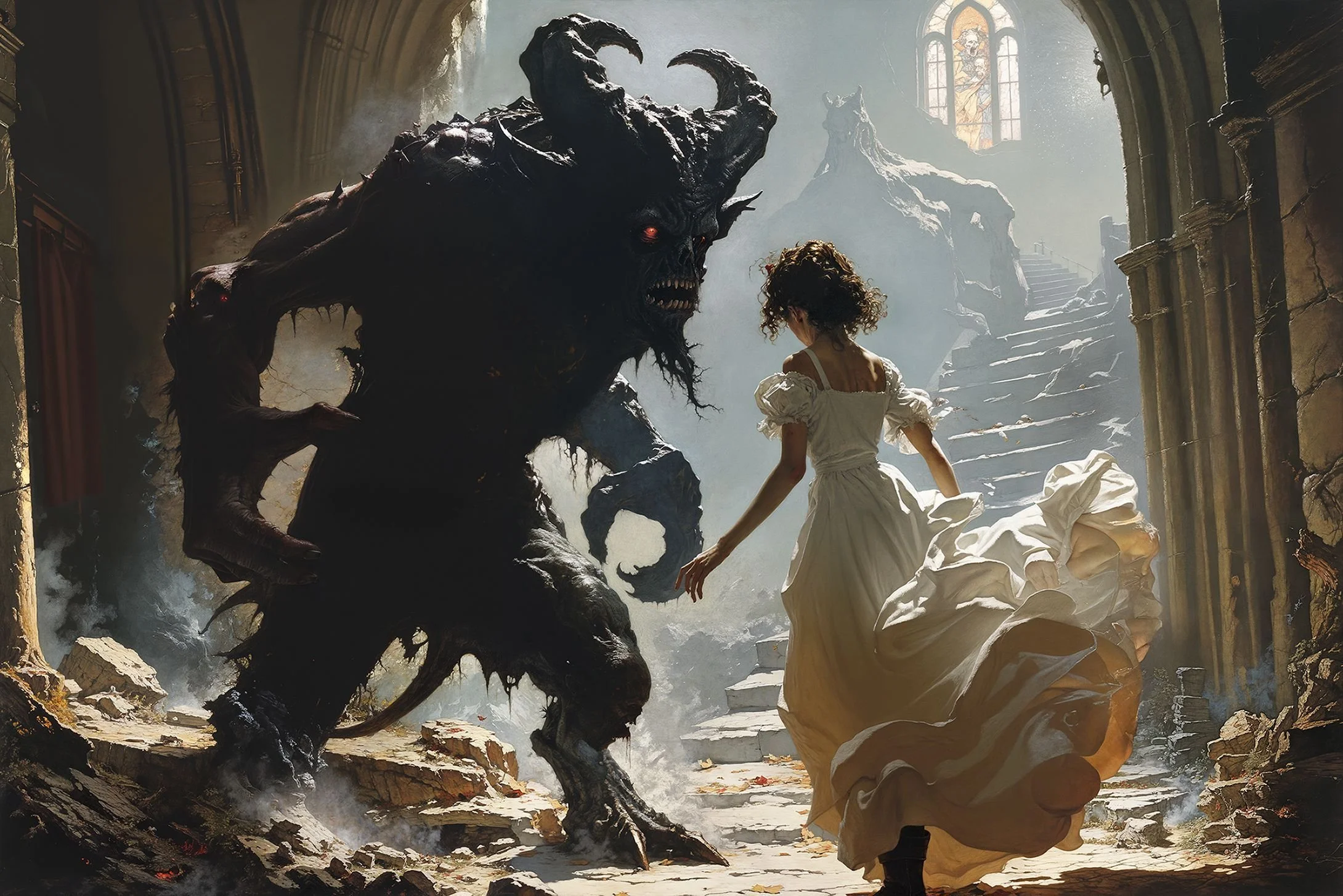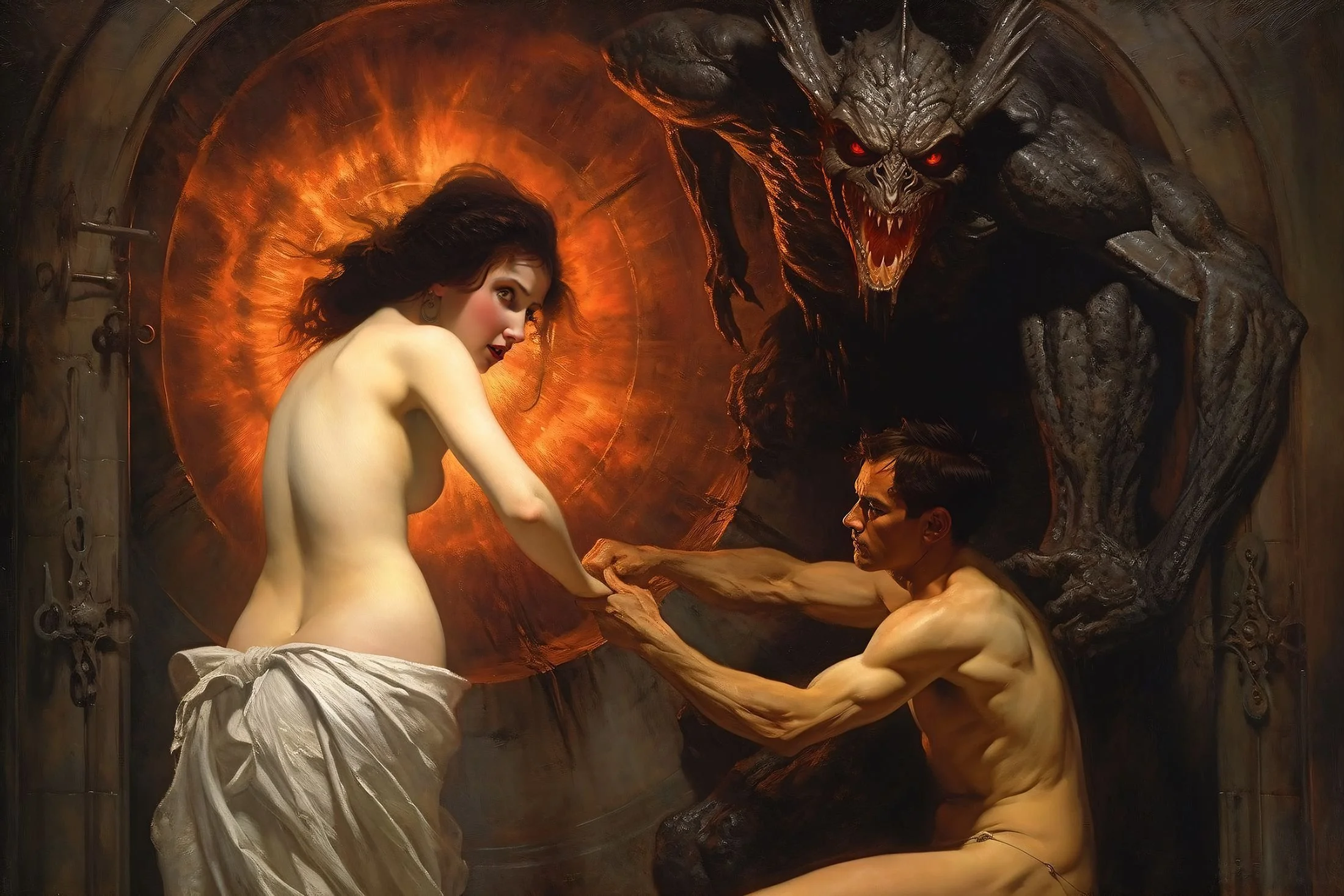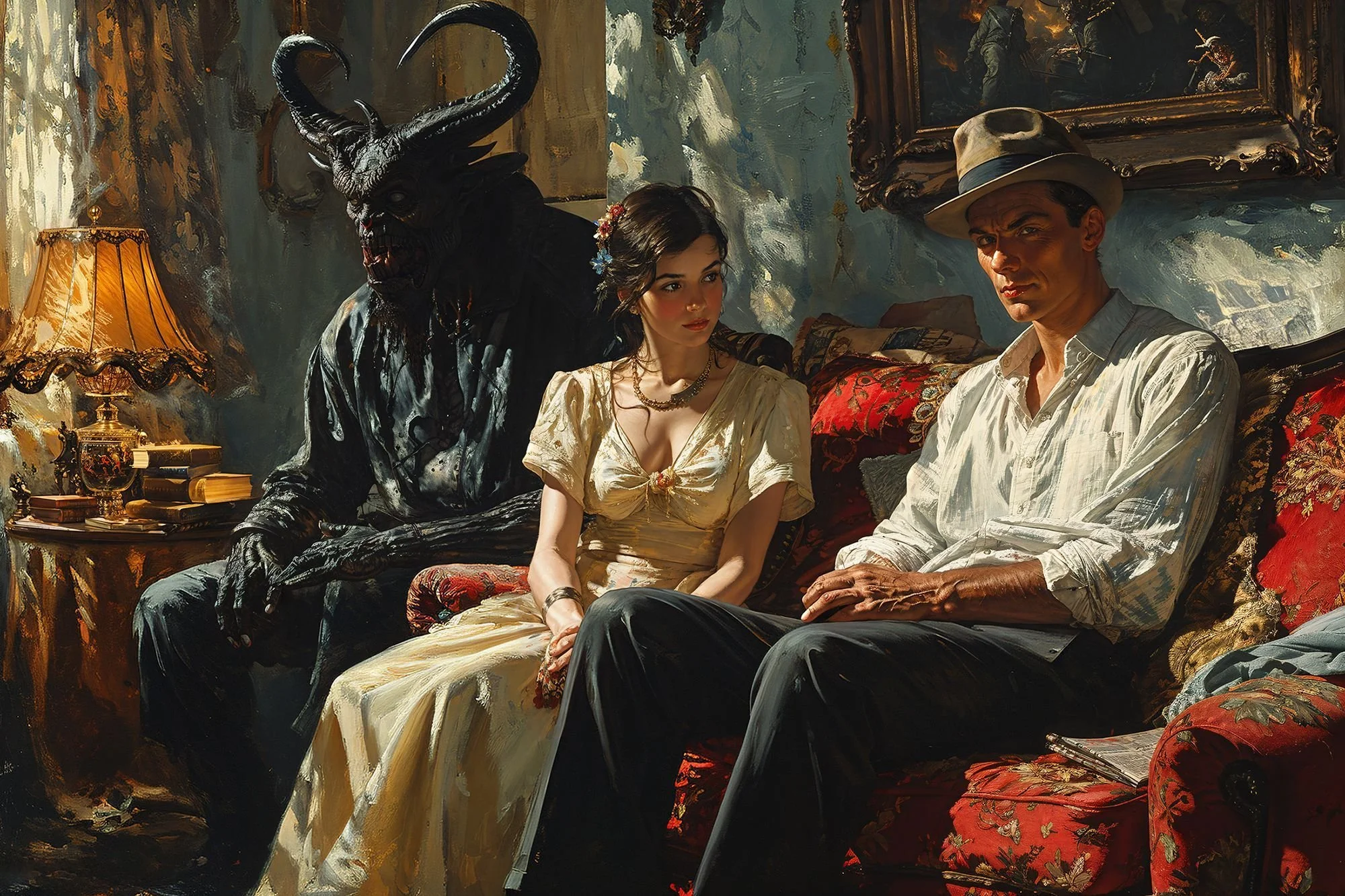 BlinD Imagery’s execution is nothing short of astonishing. His pieces are rendered with extreme precision and clarity, creating high-resolution works that seem to come to life on screen. Whether human or monstrous, his subjects—often eerie, grotesque, and fearsome—are lit in unparalleled ways. His creatures and demons are at times well-defined, as if illuminated by an elusive spotlight off-screen, or they simply emerge from the shadows, haunting and ambiguous. Fearsome, they stand alongside or entrap their human subjects with an intensity that is both terrifying and breathtaking, looming ominously over men, women, and children alike. For me, some of his art evokes the sensation of viewing nightmarish content through a vintage Stereoscope View-Master, but in the sharpest, highest definition imaginable.