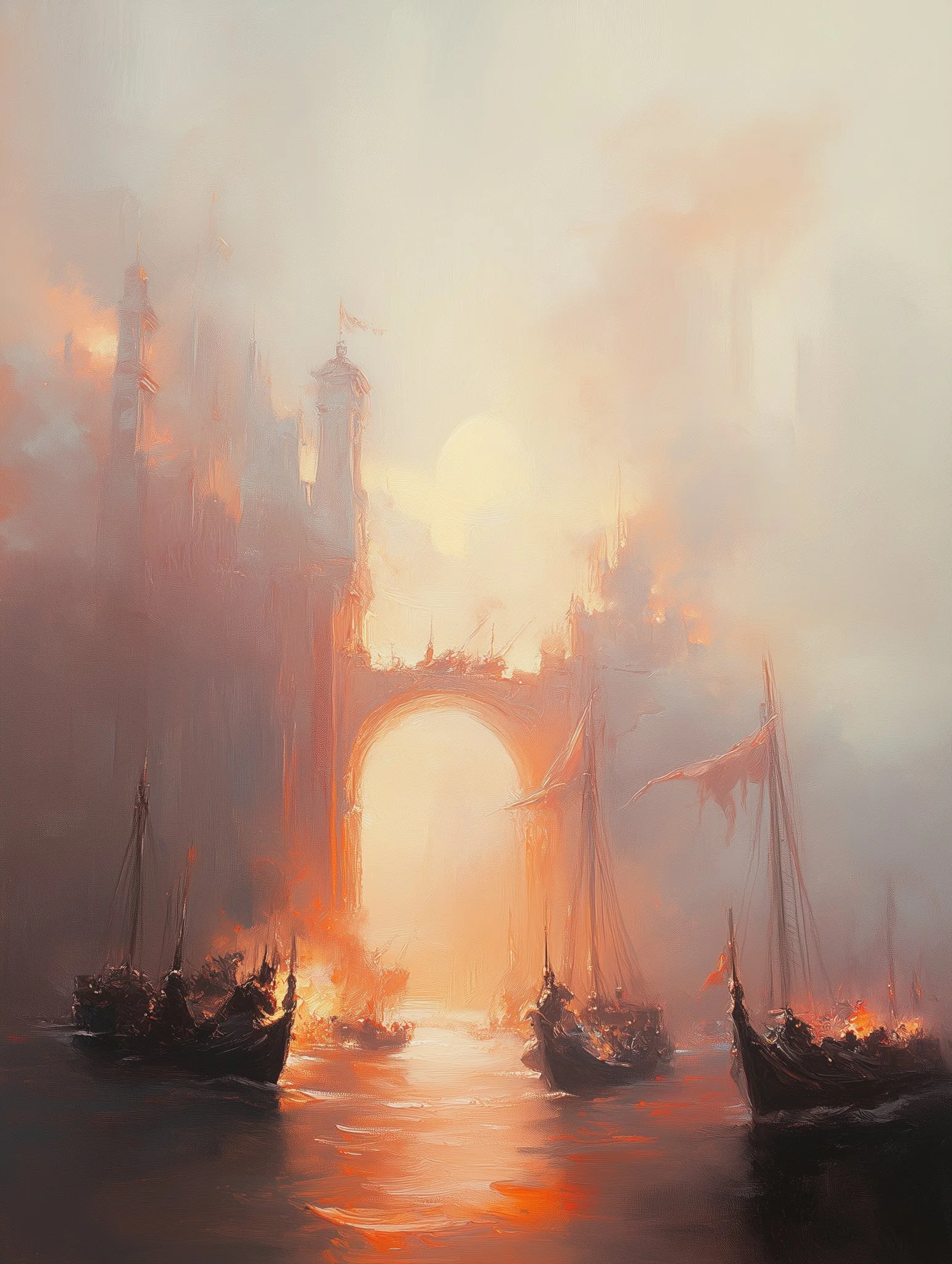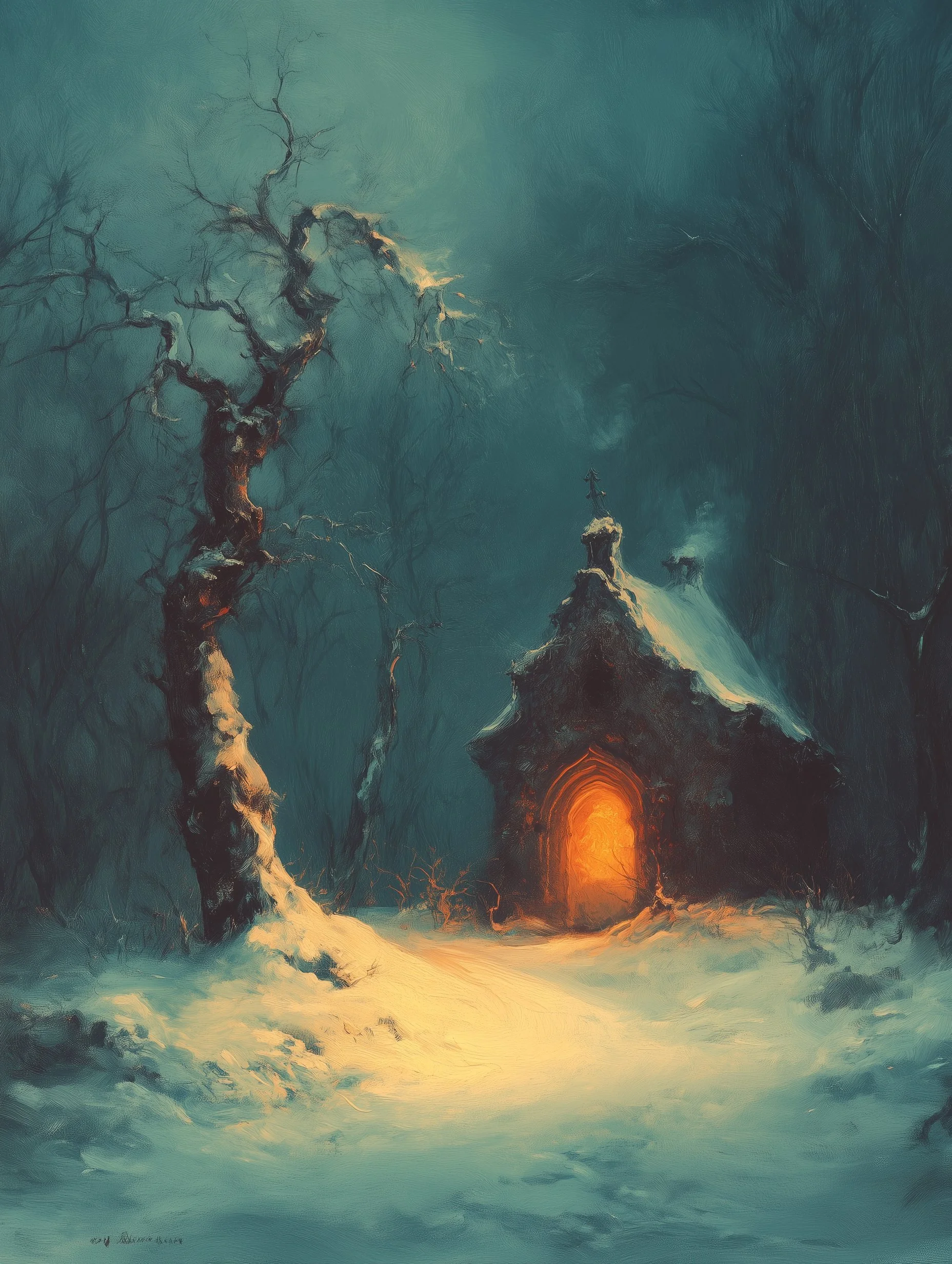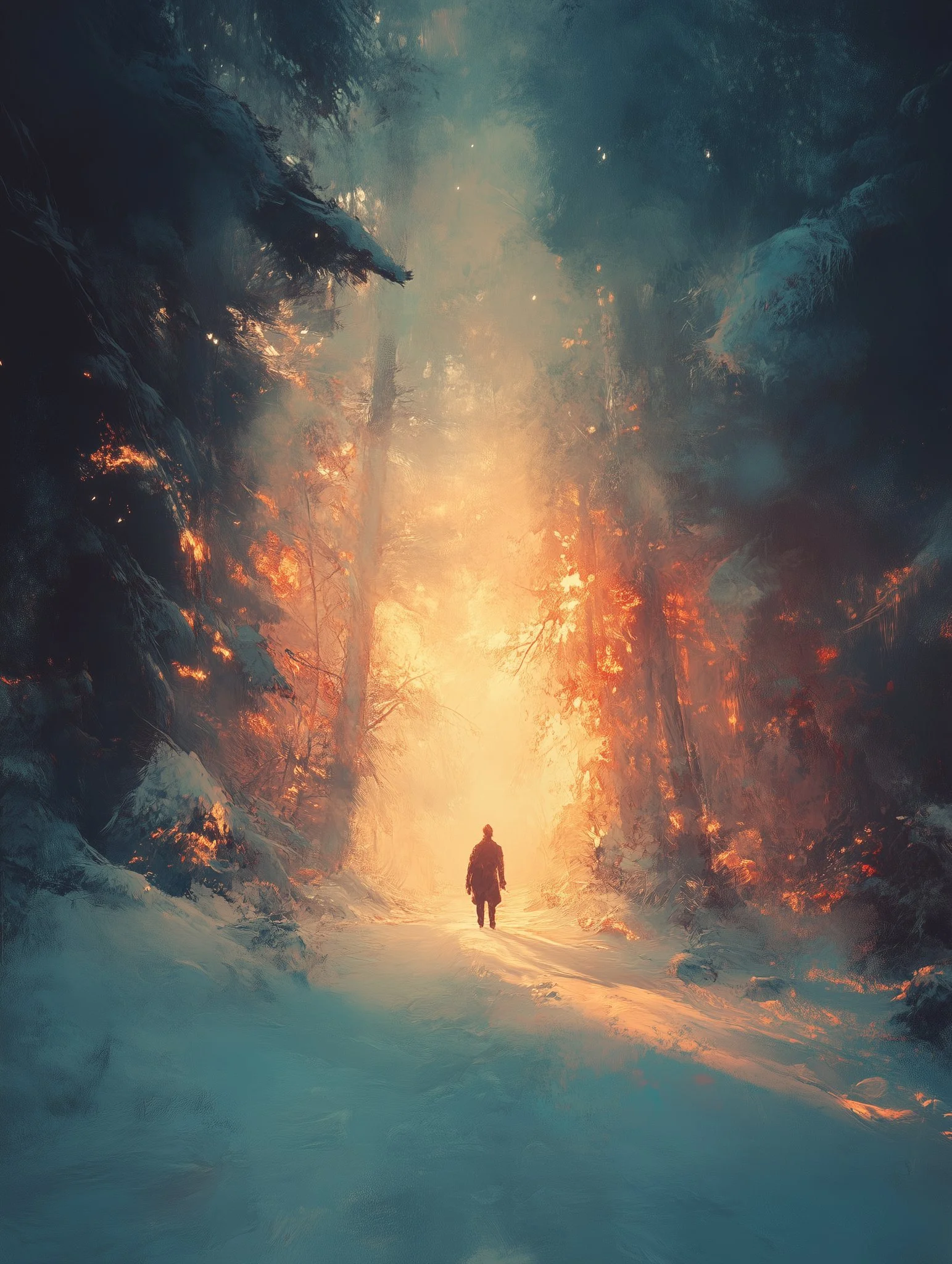 But Digiskar’s artistry is not limited to the epic. Some of his works take on a soft, painterly approach, capturing the quiet elegance of landscapes. Scenes of solitude and introspection unfold in tranquil winter or desert settings, where lone figures journey through snow-covered paths, and sandy backgrounds, bathed in the warmth of golden light. These compositions suggest transition, discovery, and a journey into the unknown—where each threshold crossed might lead to another world, another truth.