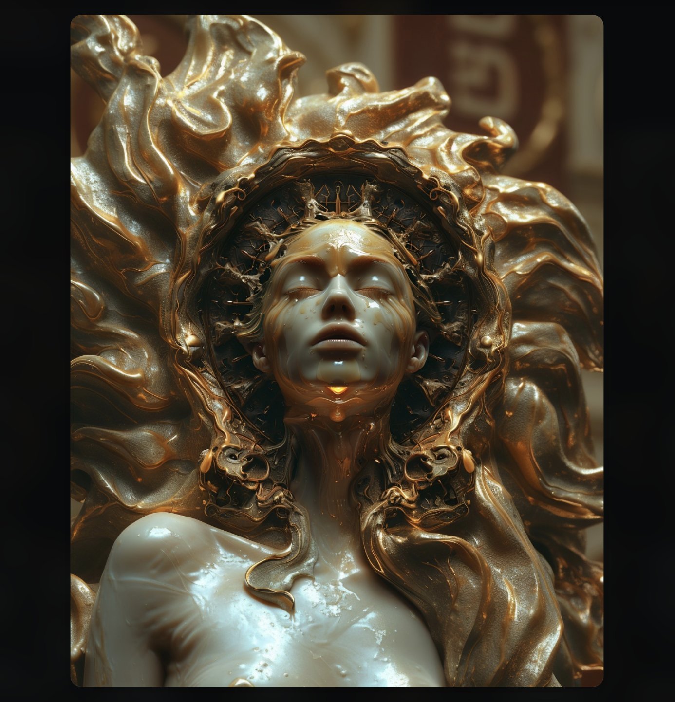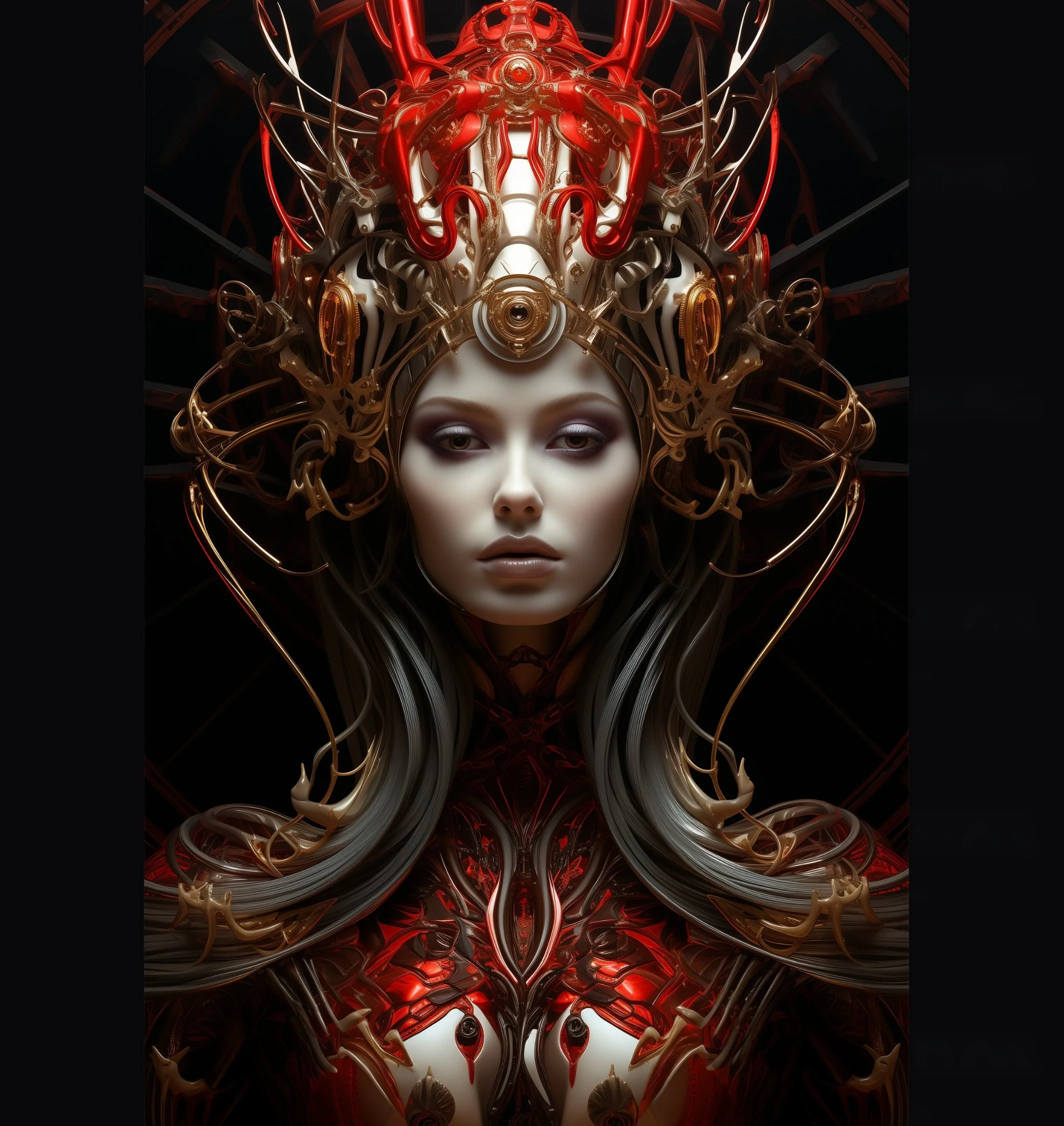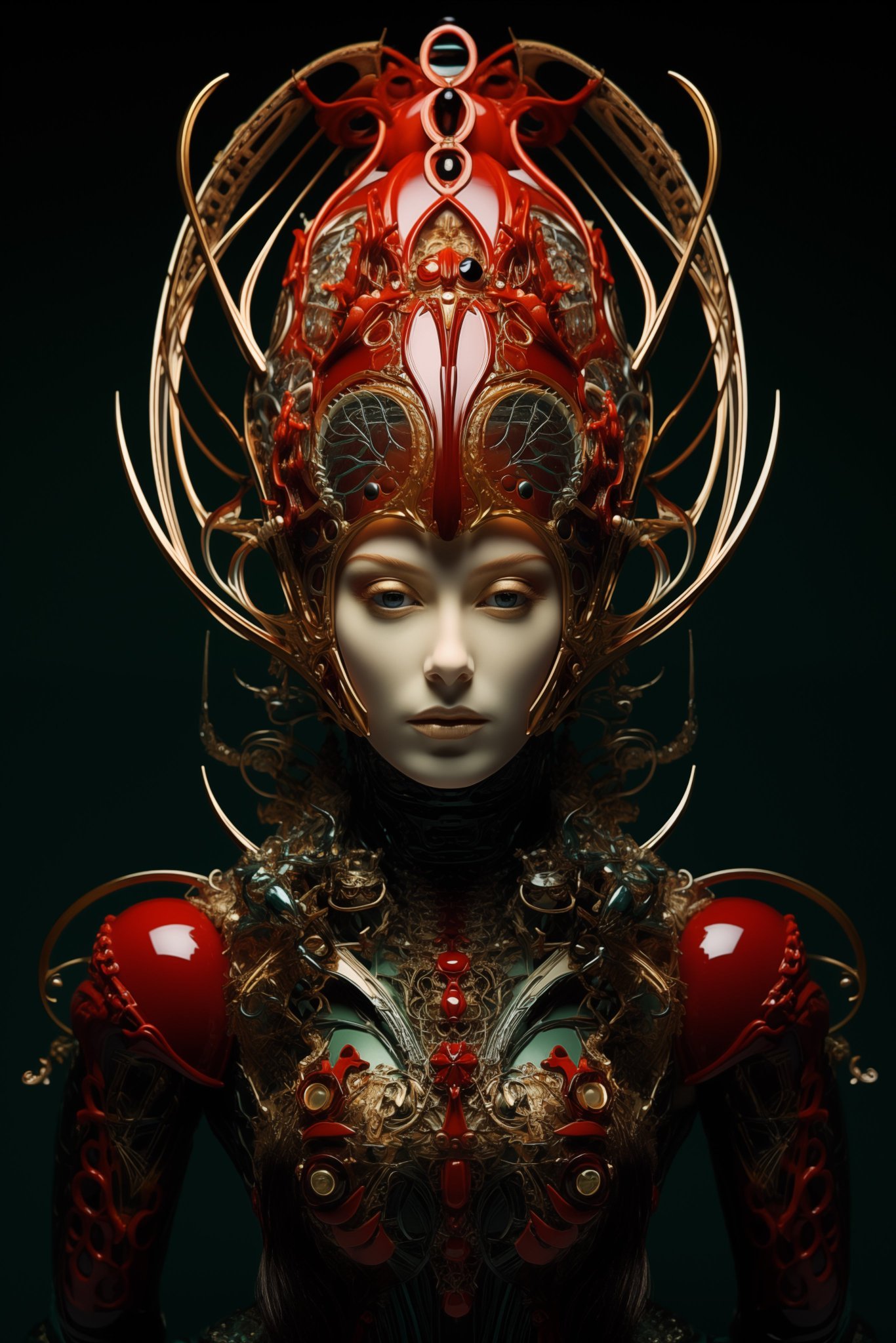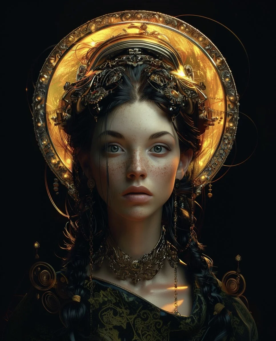 Meet hrmny_25, a talented European artist—and a true science-fiction enthusiast—whose striking signature style combines futuristic themes, fashion, and a bold color palette often dominated by reds and blacks. His distinctive style sets him apart, particularly in his portrayals of alien and futuristic women adorned in exquisite, otherworldly, symmetrical embellishments. These portraits, typically presented in a full-face angle, evoke visions of Queens and Princesses of distant futures—royalty from realms beyond our imagination. His intricate use of gold, bluish/greenish hues, and ornate patterns adds a mesmerizing layer of detail, drawing viewers into the gaze of these beautiful and futuristic beings.