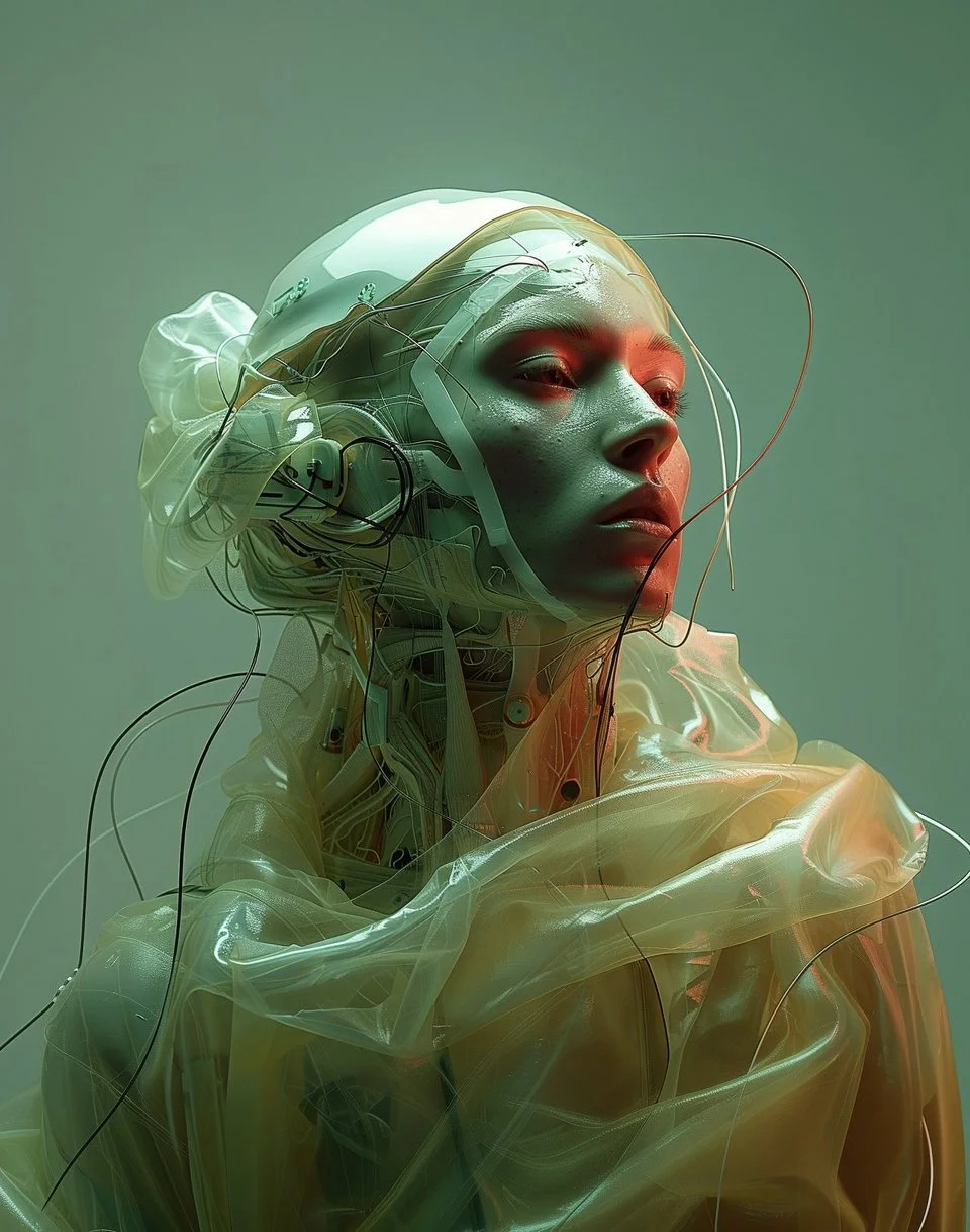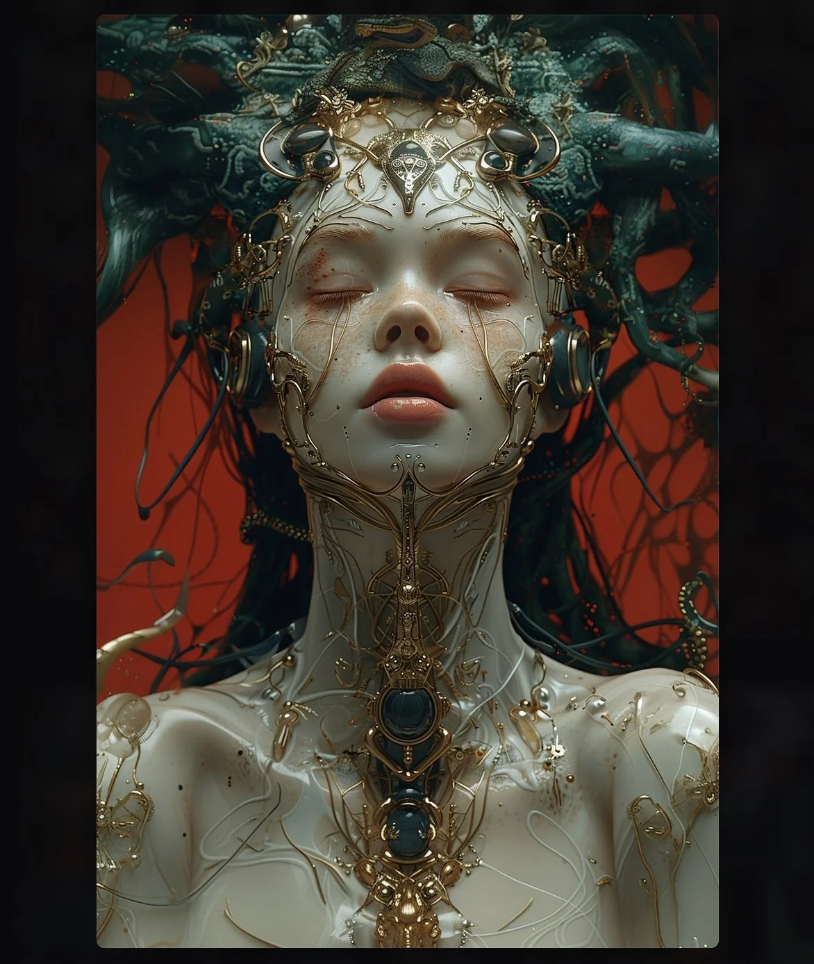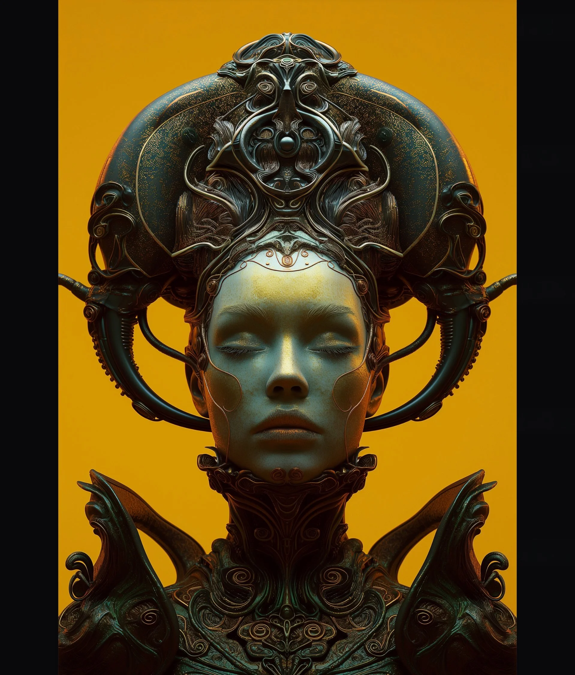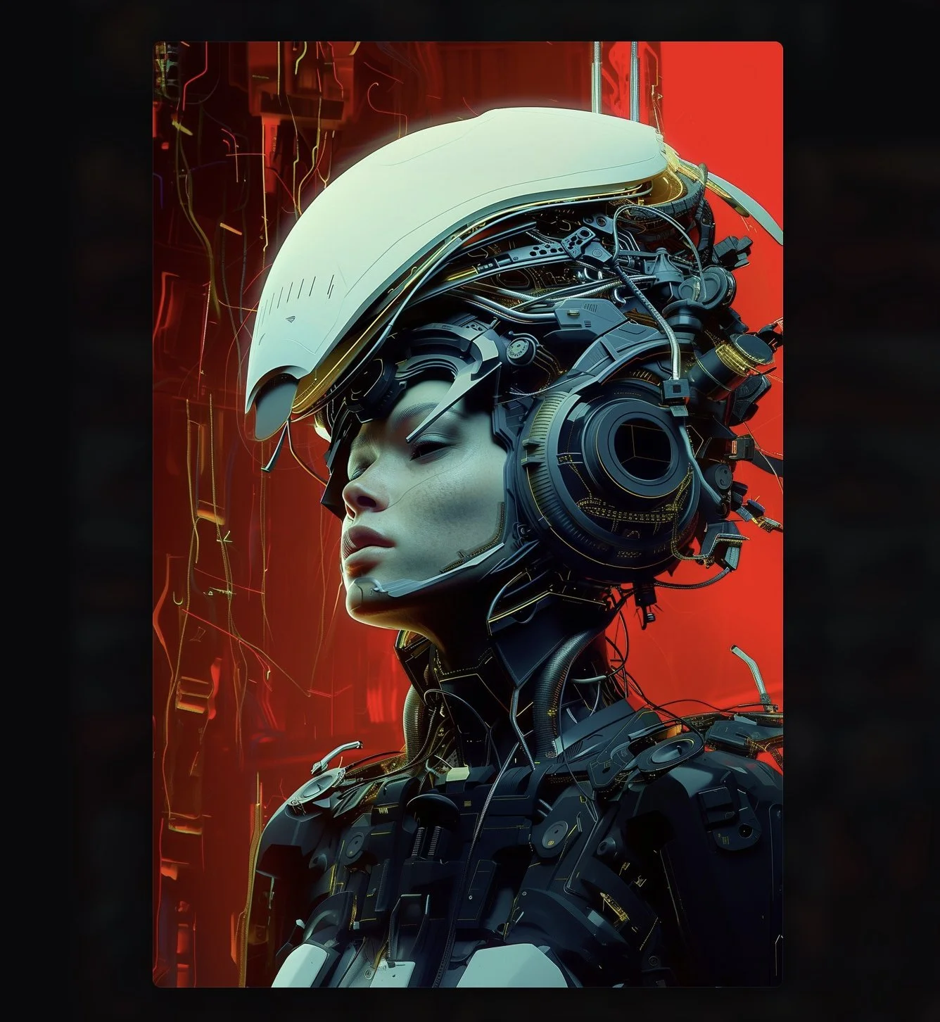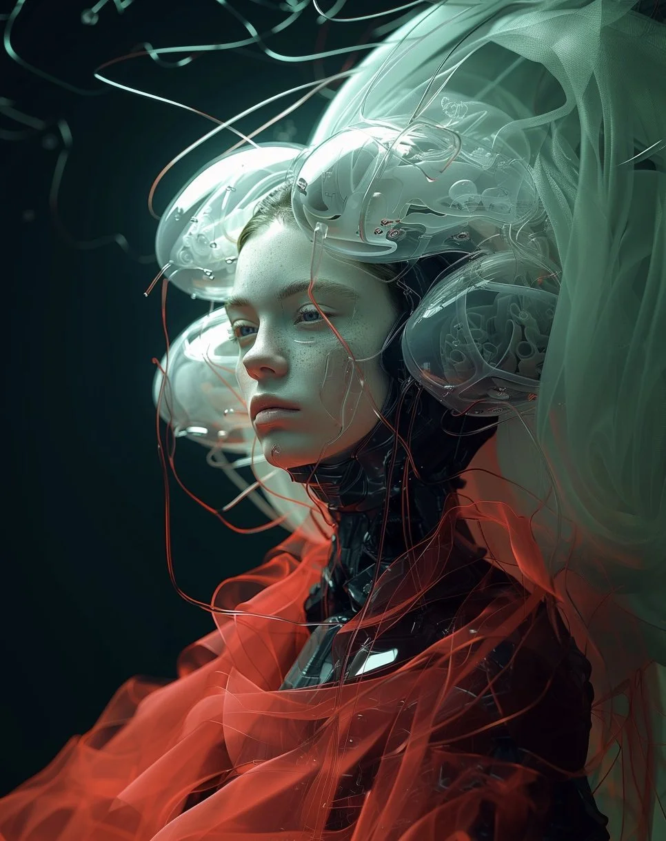 Meet hrmny_25, a talented European artist—and a true science-fiction enthusiast—whose striking signature style combines futuristic themes, fashion, and a bold color palette often dominated by reds and blacks. His distinctive style sets him apart, particularly in his portrayals of alien and futuristic women adorned in exquisite, otherworldly, symmetrical embellishments. These portraits, typically presented in a full-face angle, evoke visions of Queens and Princesses of distant futures—royalty from realms beyond our imagination. His intricate use of gold, bluish/greenish hues, and ornate patterns adds a mesmerizing layer of detail, drawing viewers into the gaze of these beautiful and futuristic beings.