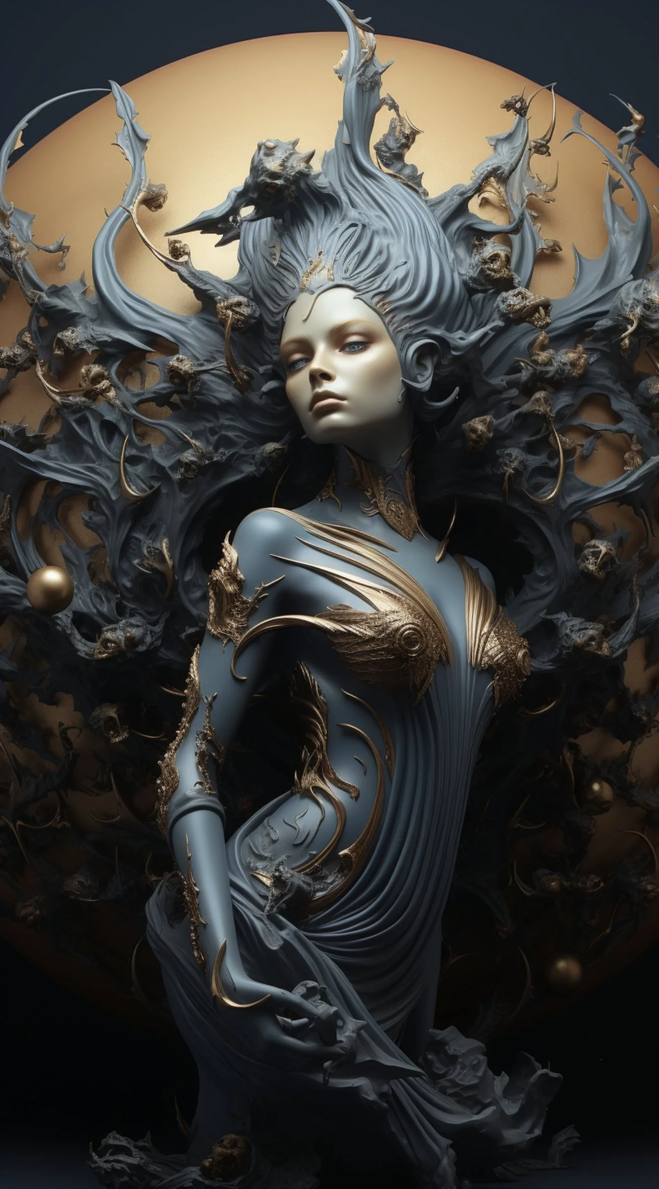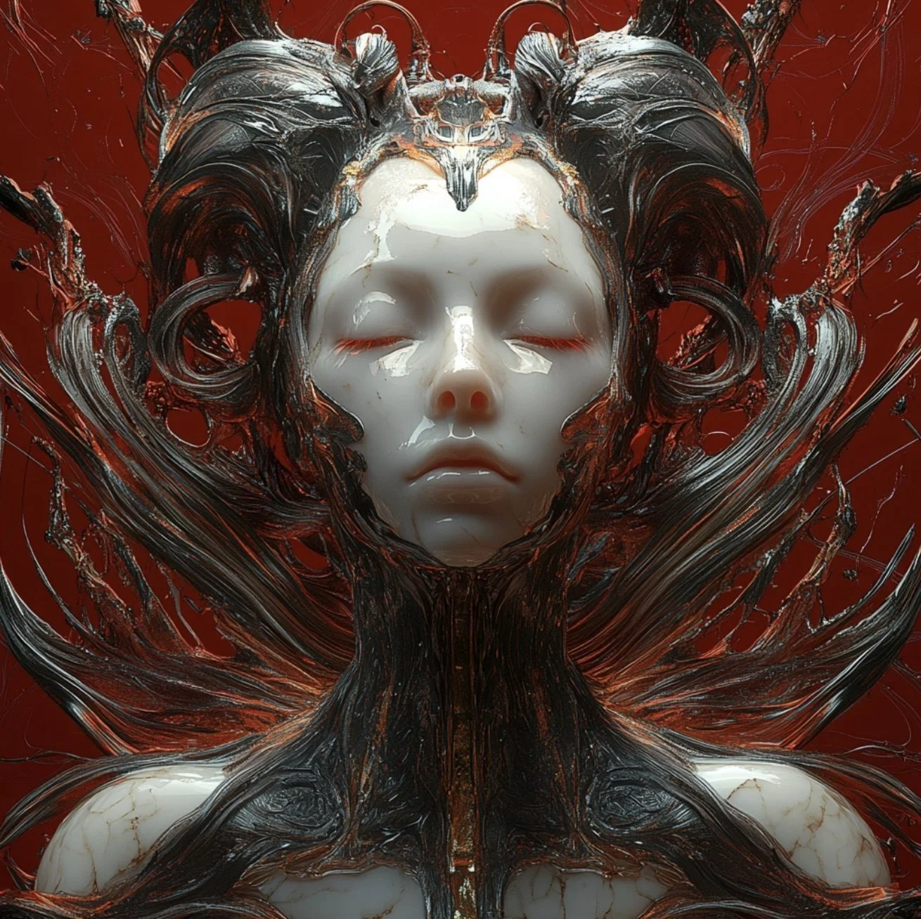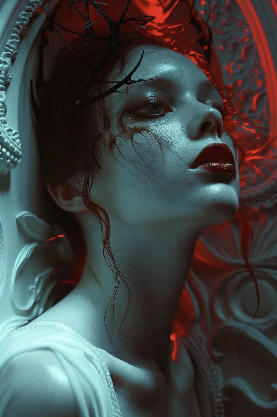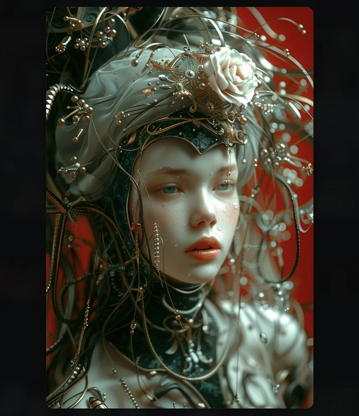 Meet hrmny_25, a talented European artist—and a true science-fiction enthusiast—whose striking signature style combines futuristic themes, fashion, and a bold color palette often dominated by reds and blacks. His distinctive style sets him apart, particularly in his portrayals of alien and futuristic women adorned in exquisite, otherworldly, symmetrical embellishments. These portraits, typically presented in a full-face angle, evoke visions of Queens and Princesses of distant futures—royalty from realms beyond our imagination. His intricate use of gold, bluish/greenish hues, and ornate patterns adds a mesmerizing layer of detail, drawing viewers into the gaze of these beautiful and futuristic beings.