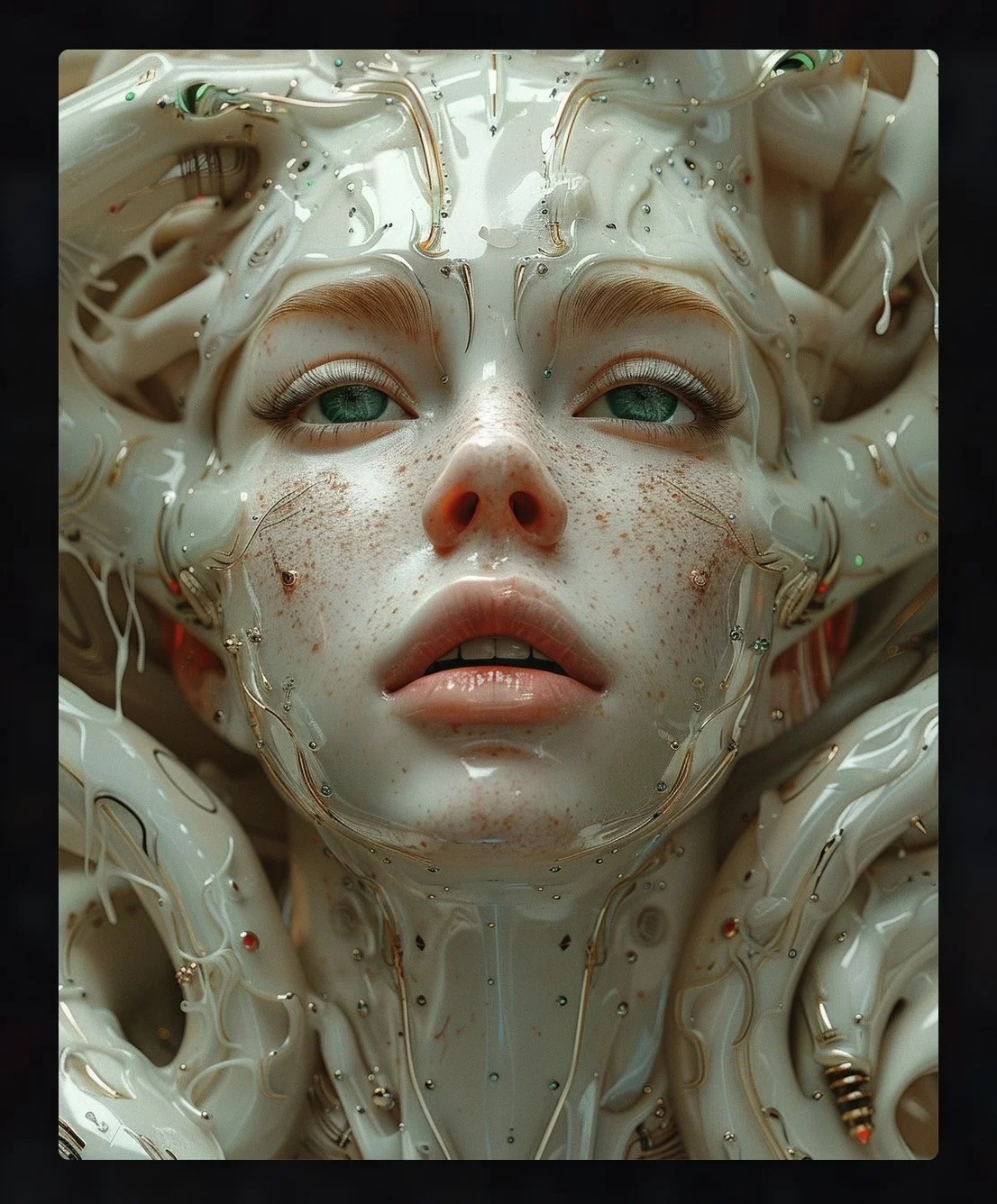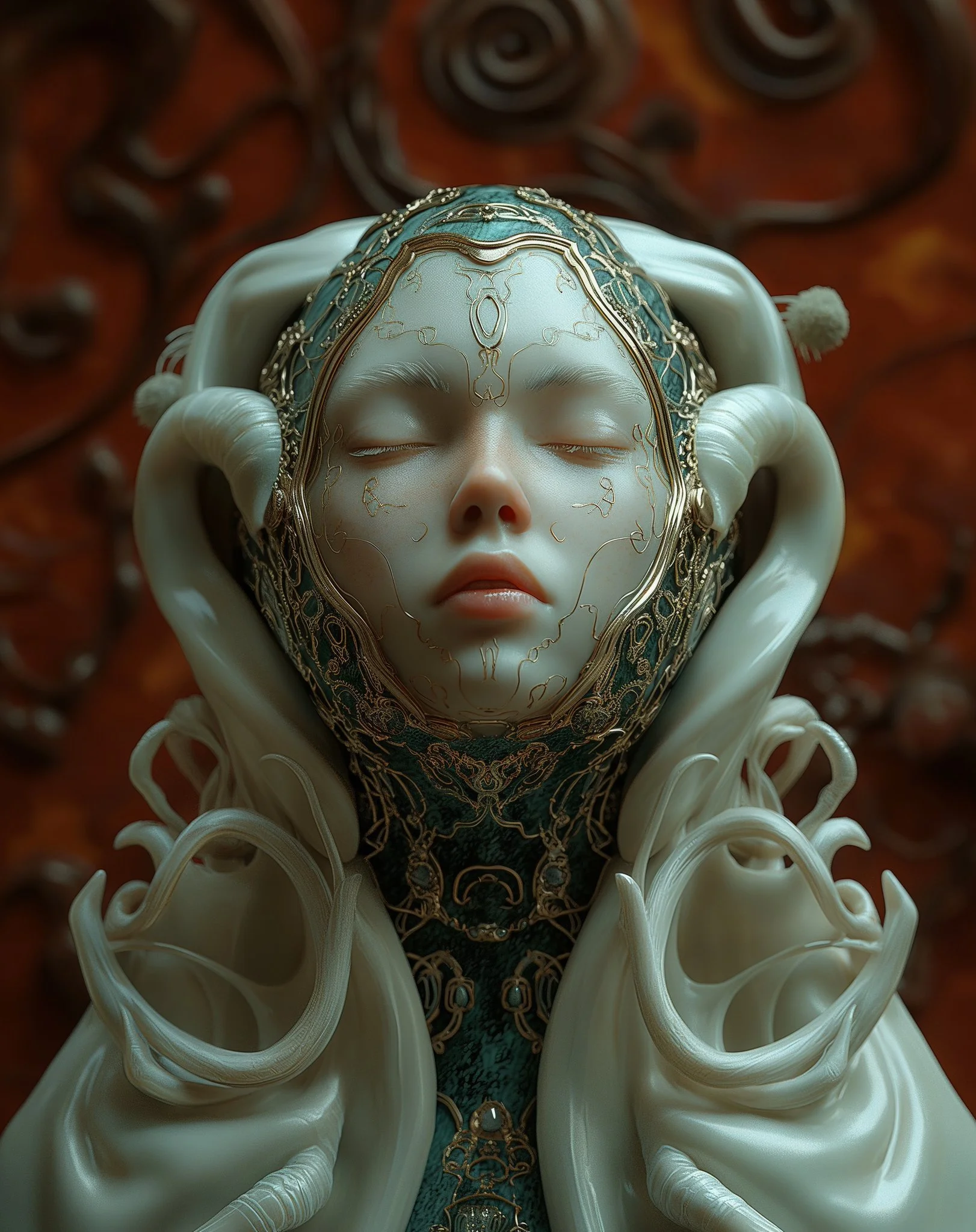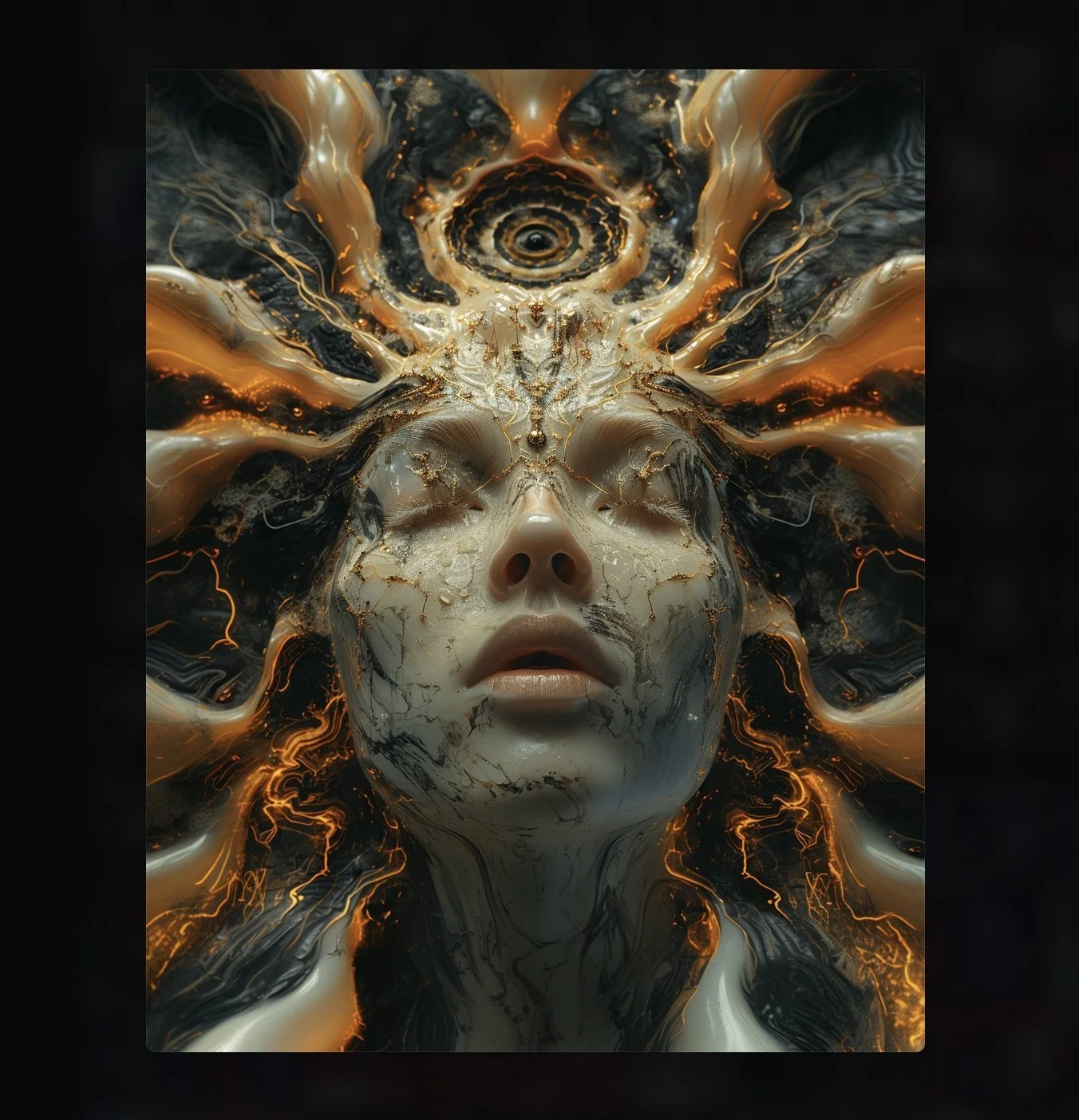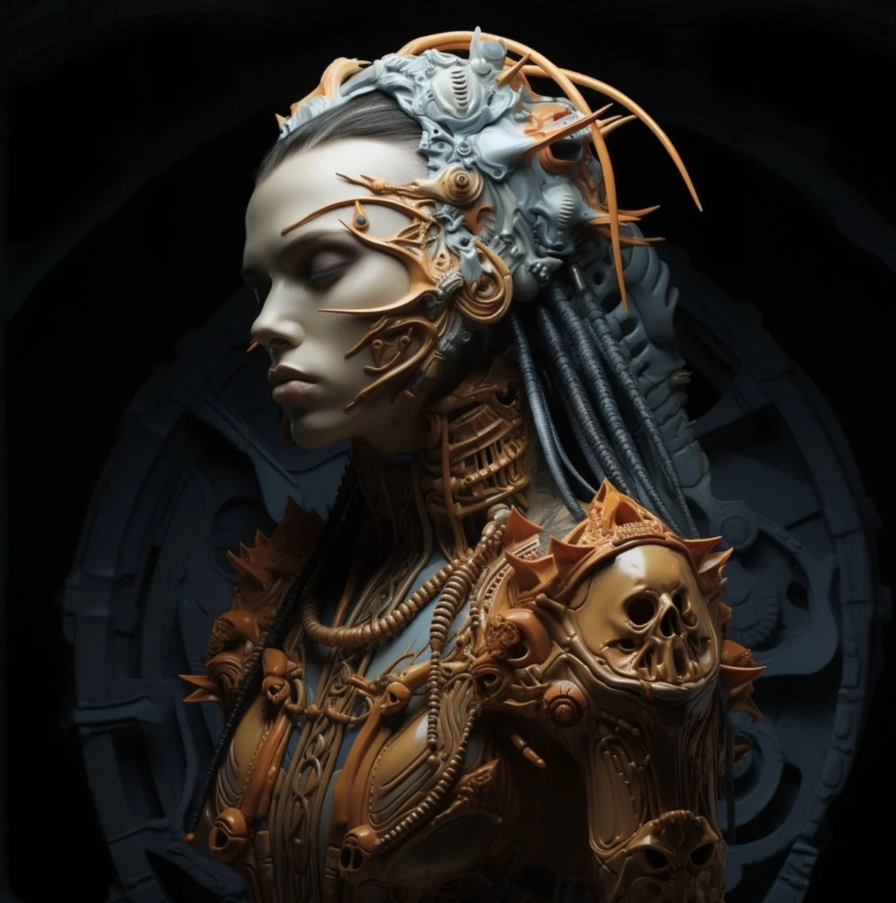 Meet hrmny_25, a talented European artist—and a true science-fiction enthusiast—whose striking signature style combines futuristic themes, fashion, and a bold color palette often dominated by reds and blacks. His distinctive style sets him apart, particularly in his portrayals of alien and futuristic women adorned in exquisite, otherworldly, symmetrical embellishments. These portraits, typically presented in a full-face angle, evoke visions of Queens and Princesses of distant futures—royalty from realms beyond our imagination. His intricate use of gold, bluish/greenish hues, and ornate patterns adds a mesmerizing layer of detail, drawing viewers into the gaze of these beautiful and futuristic beings.