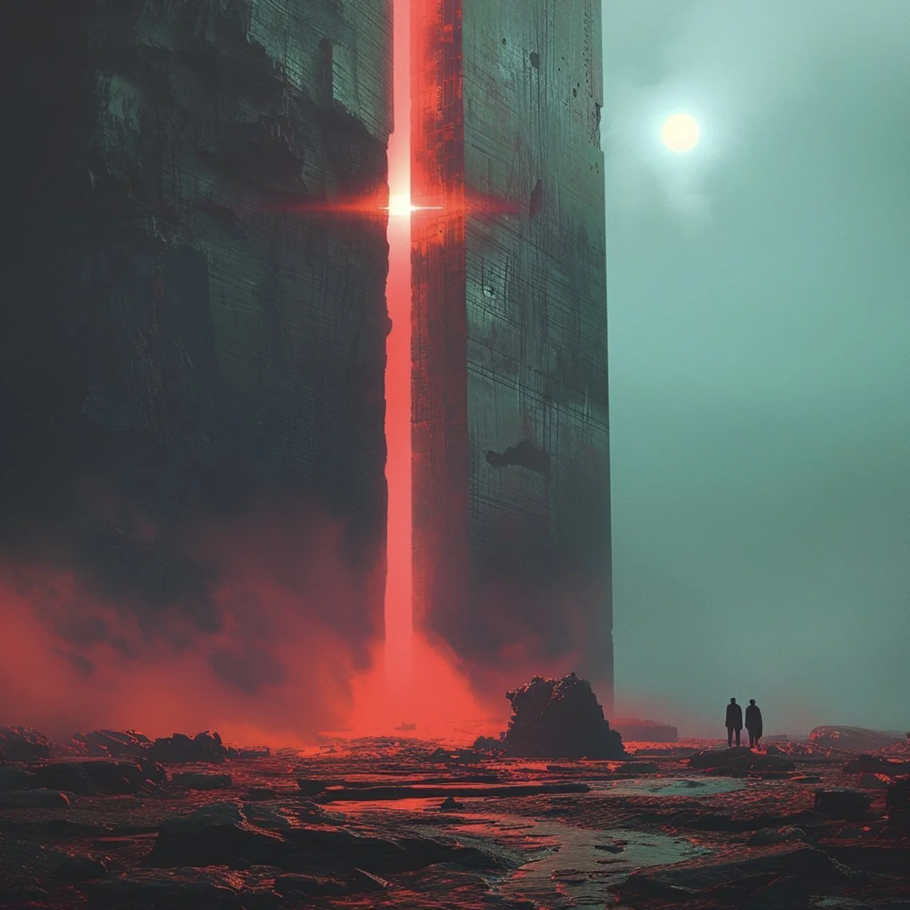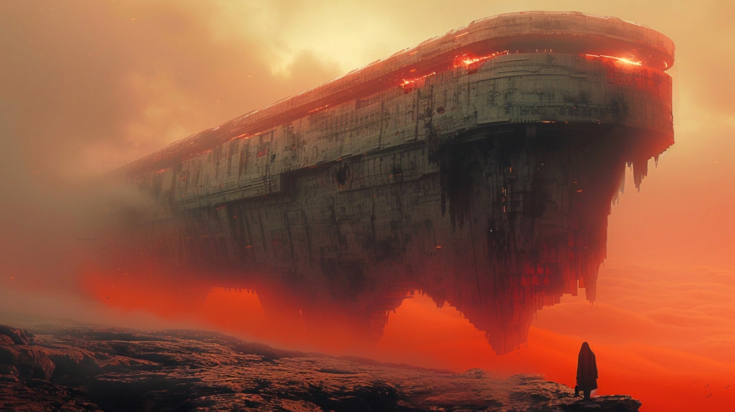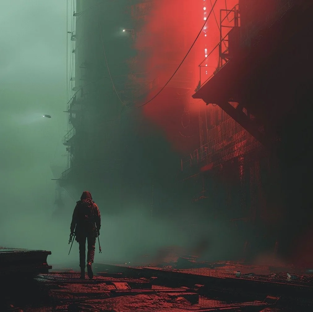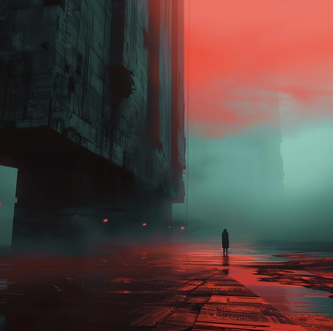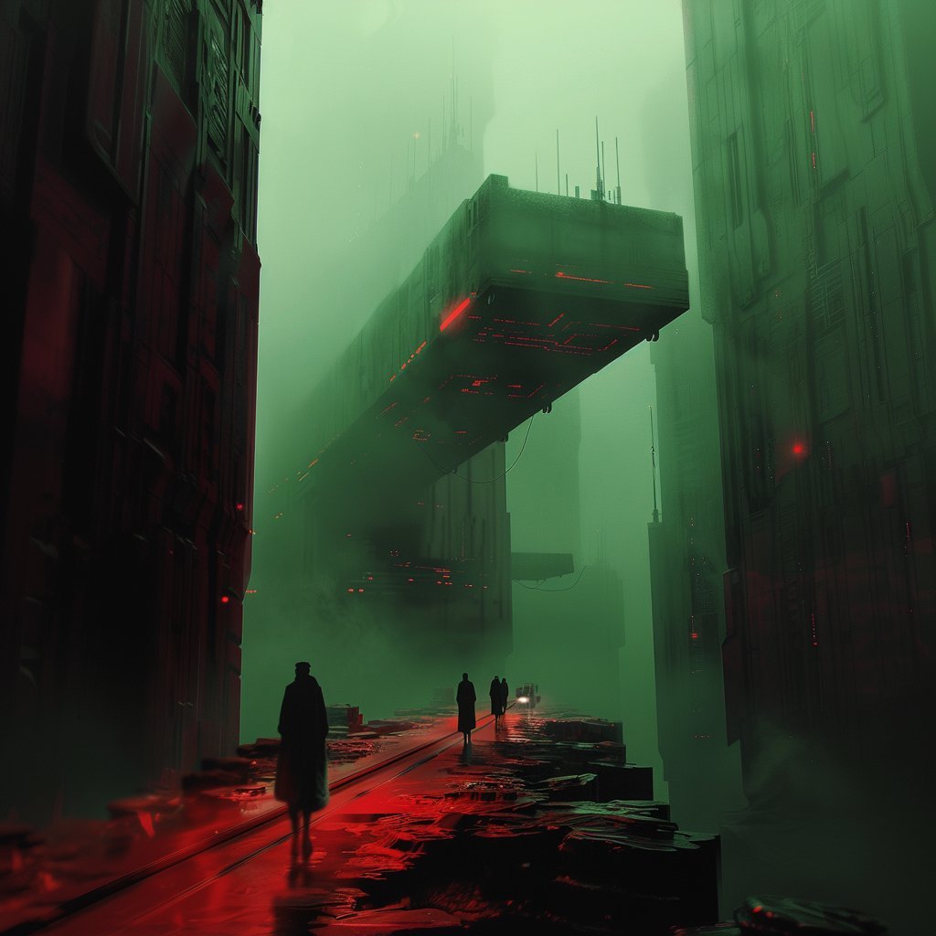 Beyond portraits, hrmny_25’s art often scales human figures against vast dystopian backdrops, creating scenes that are both awe-inspiring and hauntingly beautiful. This is where his use of reds and blacks shines and where his mastery in blending human elements with grand, imposing sci-fi landscapes makes his work not only visually stunning but also deeply evocative, inviting us to ponder the place of humanity within these expansive, speculative settings.