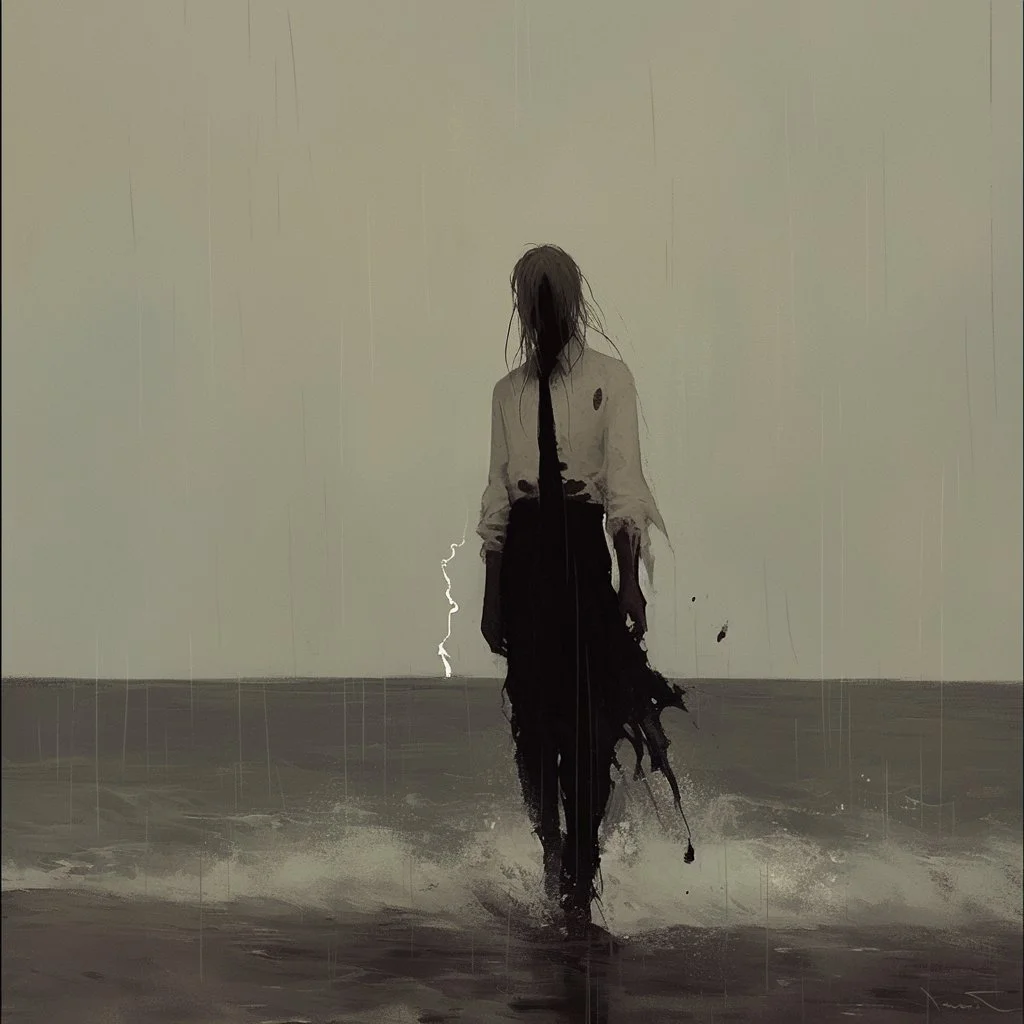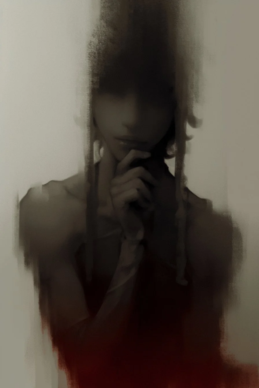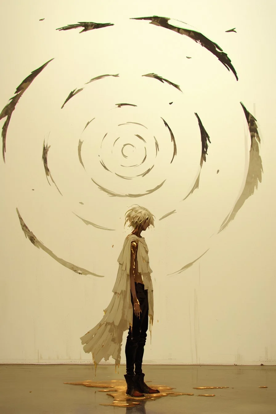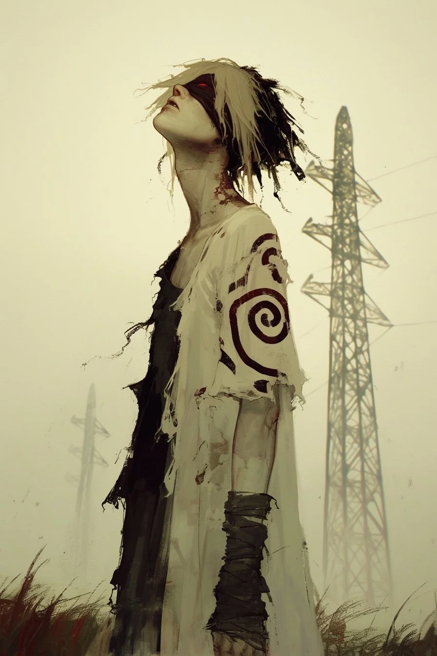 Lysxis’s technique is as unusual as his themes. He works almost exclusively with Midjourney’s Niji mode, a model designed for anime and Eastern-style aesthetics, but he twists its bright conventions into something altogether more uncanny. The colors are muted, and washed-out tones elevate the sense of disquiet. His prompts are often lines of poetry or surreal fragments of writing—dreamlike cues that yield raw, unpredictable visuals. This poetic approach shows that his work is less about perfection and more about feeling—about glimpses of a tender, broken world trying to make sense of itself.