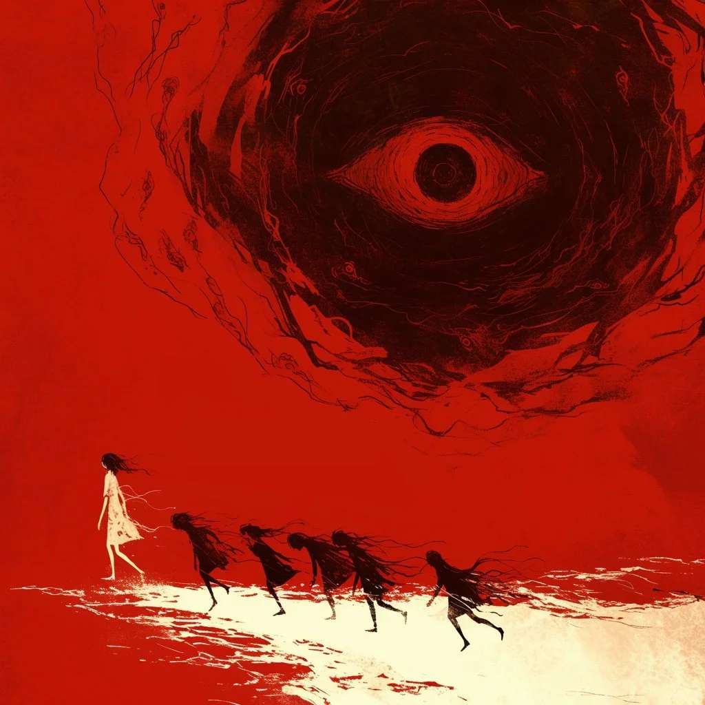 The recurring motifs are important in Lysxis’s work—red eyes glowing in the dusk, antlers crowning anonymous silhouettes, strange spirals etched into flesh or drifting across backgrounds. These elements add layers of symbolism to his images, whispering of pain, identity, and transformation. But even in the stillness of his compositions, there’s tension and unresolved suffering: a soft hand curled around a smartphone or coffee cup, a lone figure submerged in water, children standing before—or perhaps running from—an all-seeing cosmic eye. These are portraits of shy defiance, where fragility and darkness share the same skin, and innocence is ripped from the young.