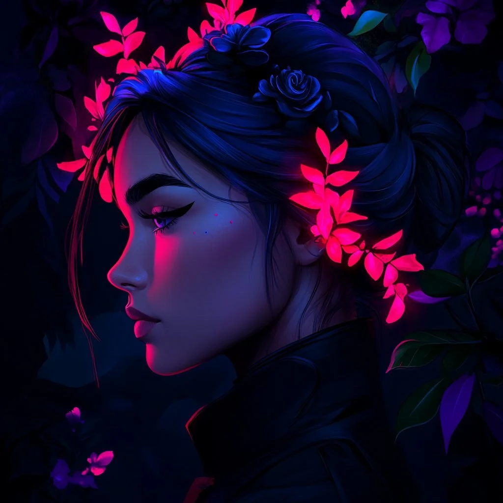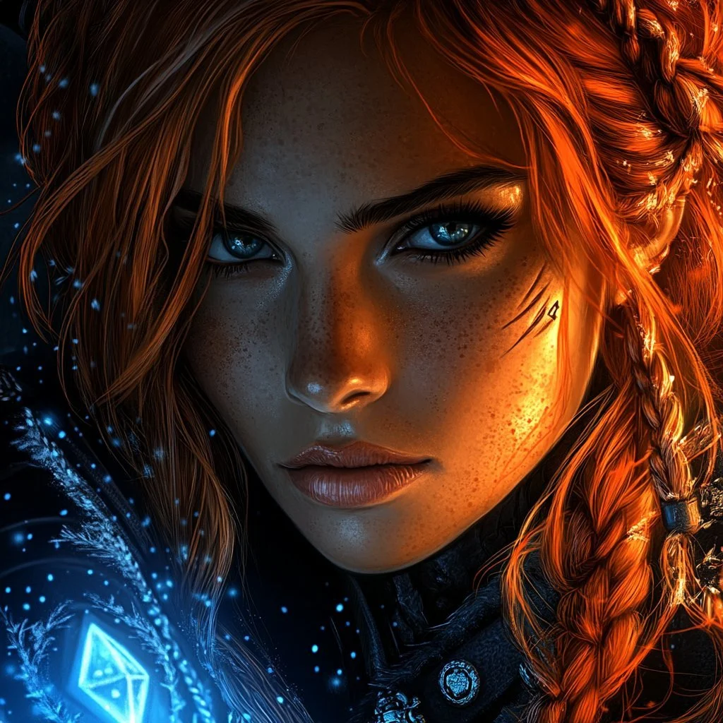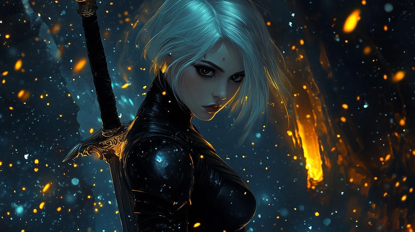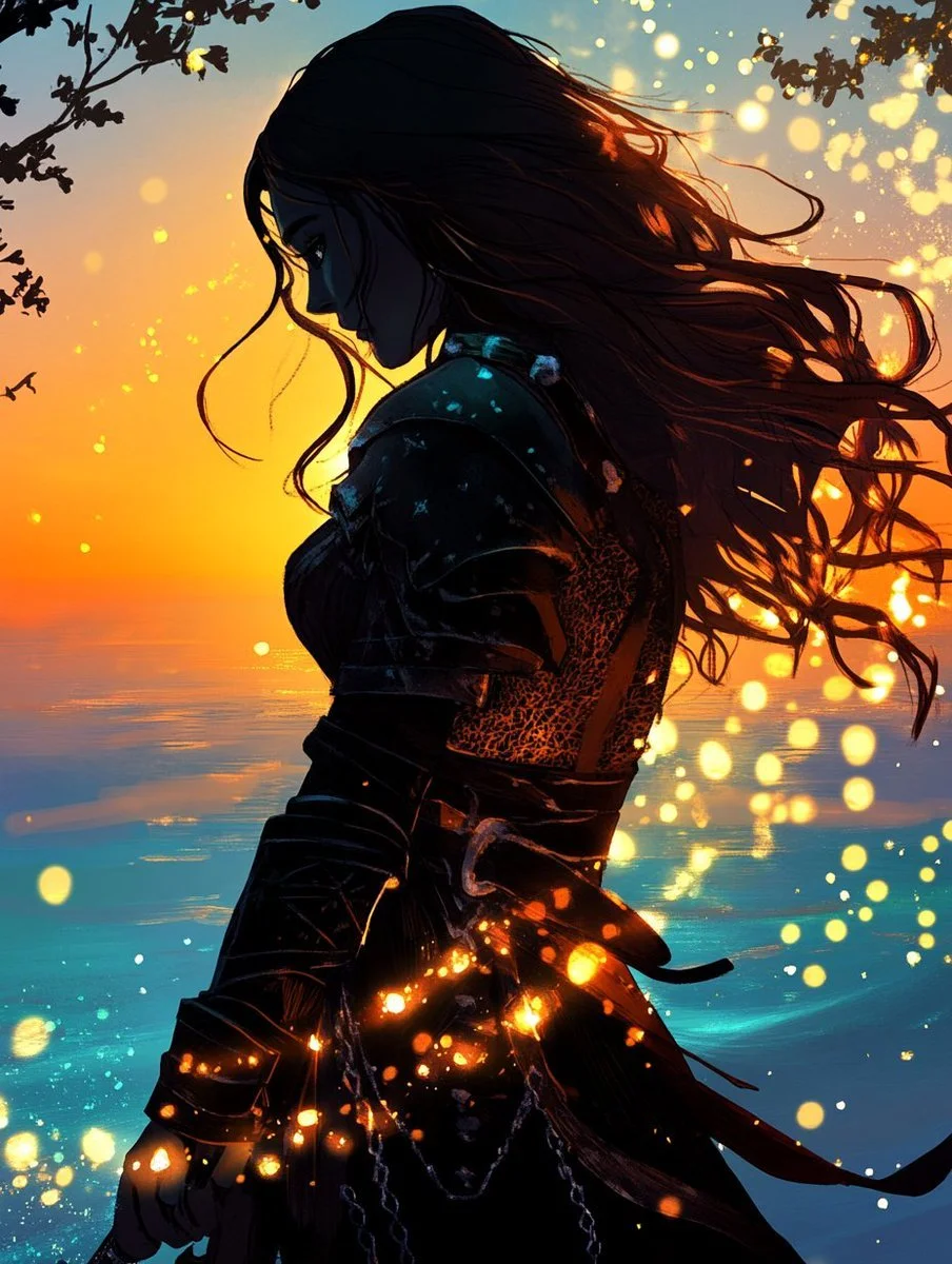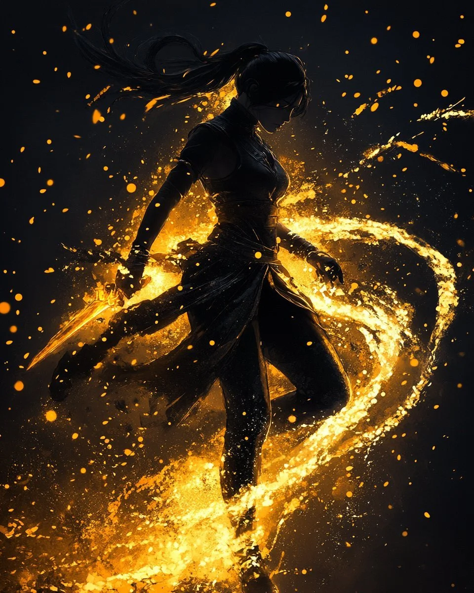 An AI enthusiast and hobbyist worldbuilder, Magik Chance crafts images that evoke the enchanting realms of classic fantasy illustrations or video game concept art. Her color palette often centers around deep blacks, rich ambers, and fiery oranges, contrasted with neon purples and electric blues (bringing to mind, for example, the gorgeous tones of such games as Ori and the Blind Forest). Each piece she creates is imbued with a sense of wonder, where characters feel poised on the brink of adventure, inviting us to explore the unknown.