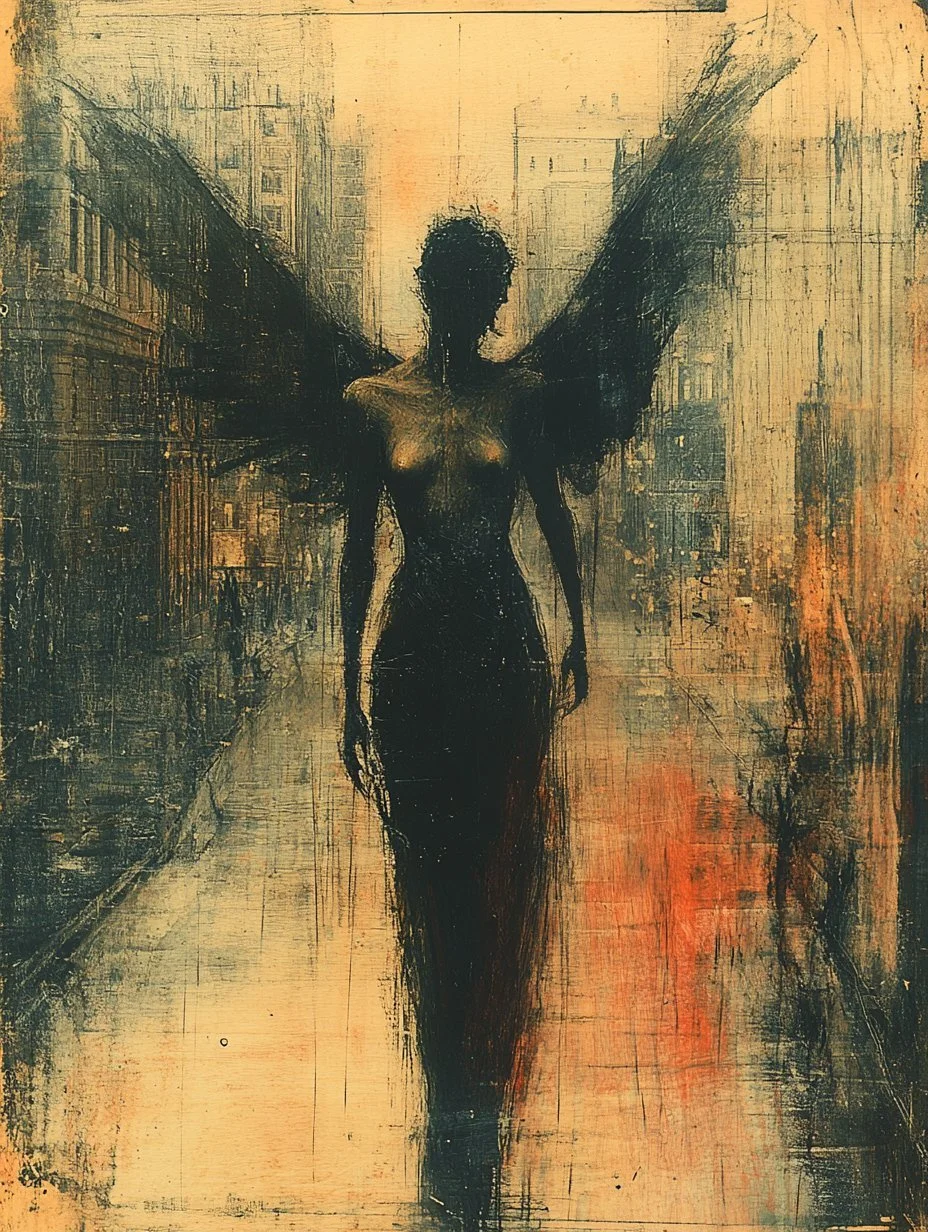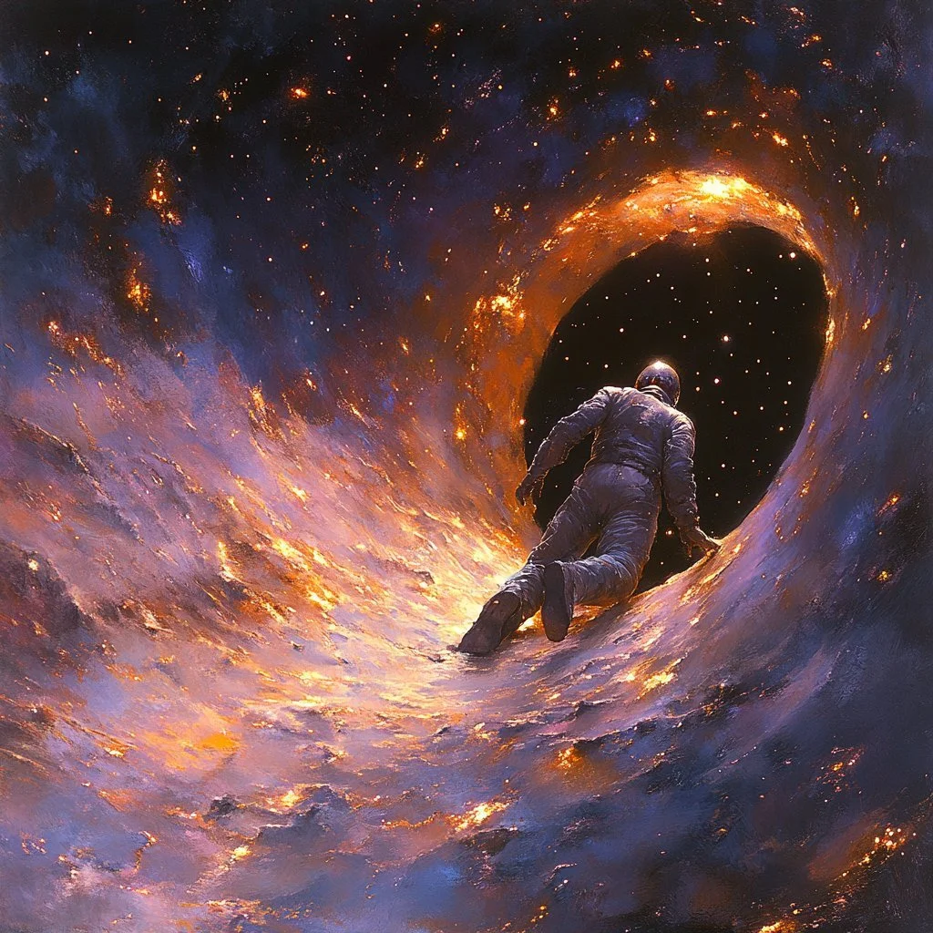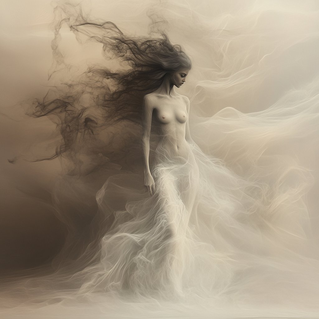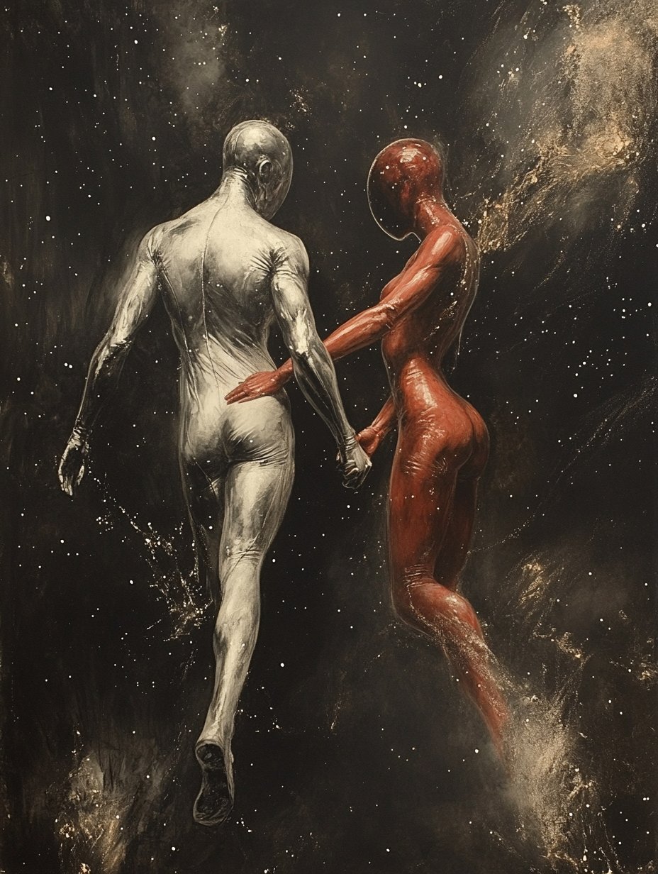 Mitra’s muted color palette, dominated by golds, browns, and sometimes blues, greens, and fiery reds, evokes the essence of forgotten worlds and celestial visions. His fantasy pieces ground the extraordinary in realistic settings, creating a sense of wonder that feels tangible, while his more abstract works lean into cosmic and existential themes, where the human form dissolves into something greater, something unknowable.