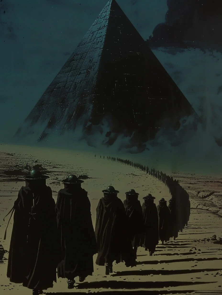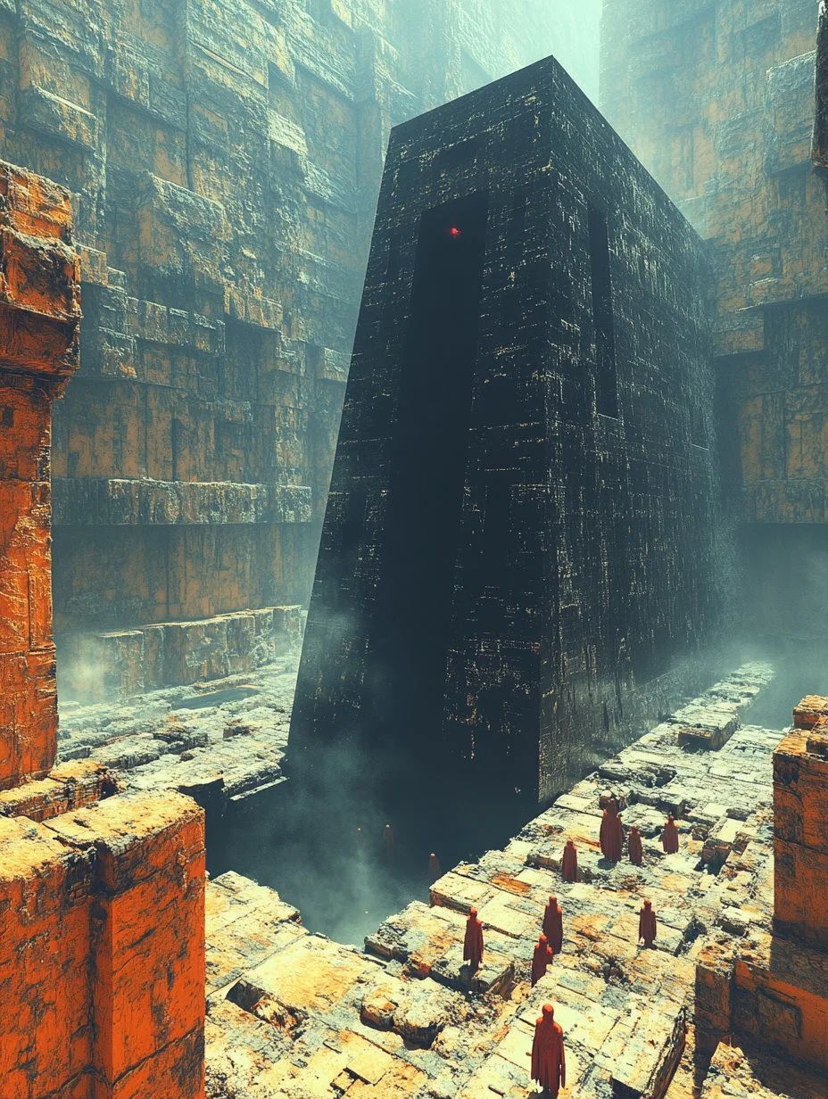 Beyond the vast dunes, Mitra's art often bends reality itself. Architectural forms twist and interlock in impossible ways, creating intricate, dreamlike mazes that challenge perception. There is a fascination with duality—light and dark, order and chaos—all playing out in his compositions through bold contrasts in color and theme. At times, his work even suggests a fusion of spirituality and technology, questioning the intersection of faith and the digital age, the ancient and the future.