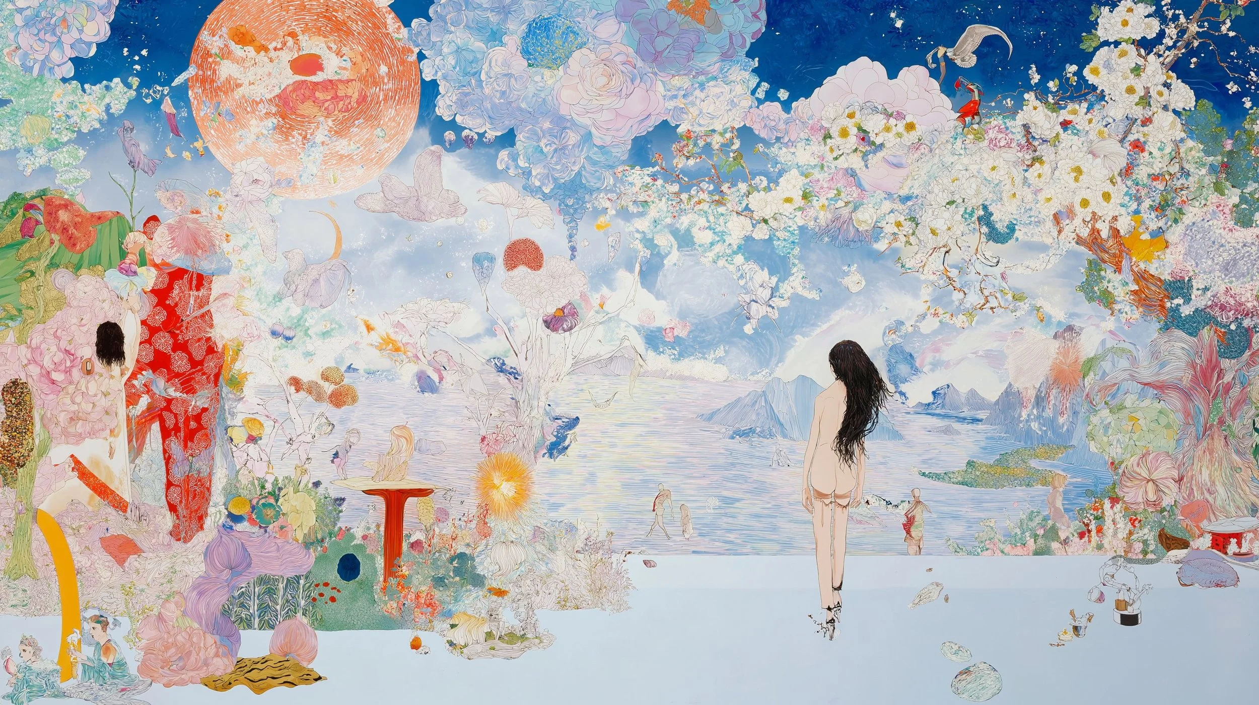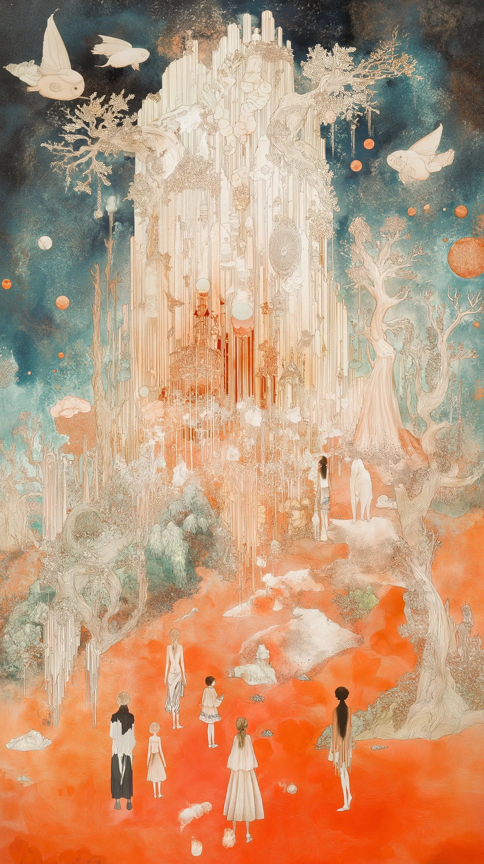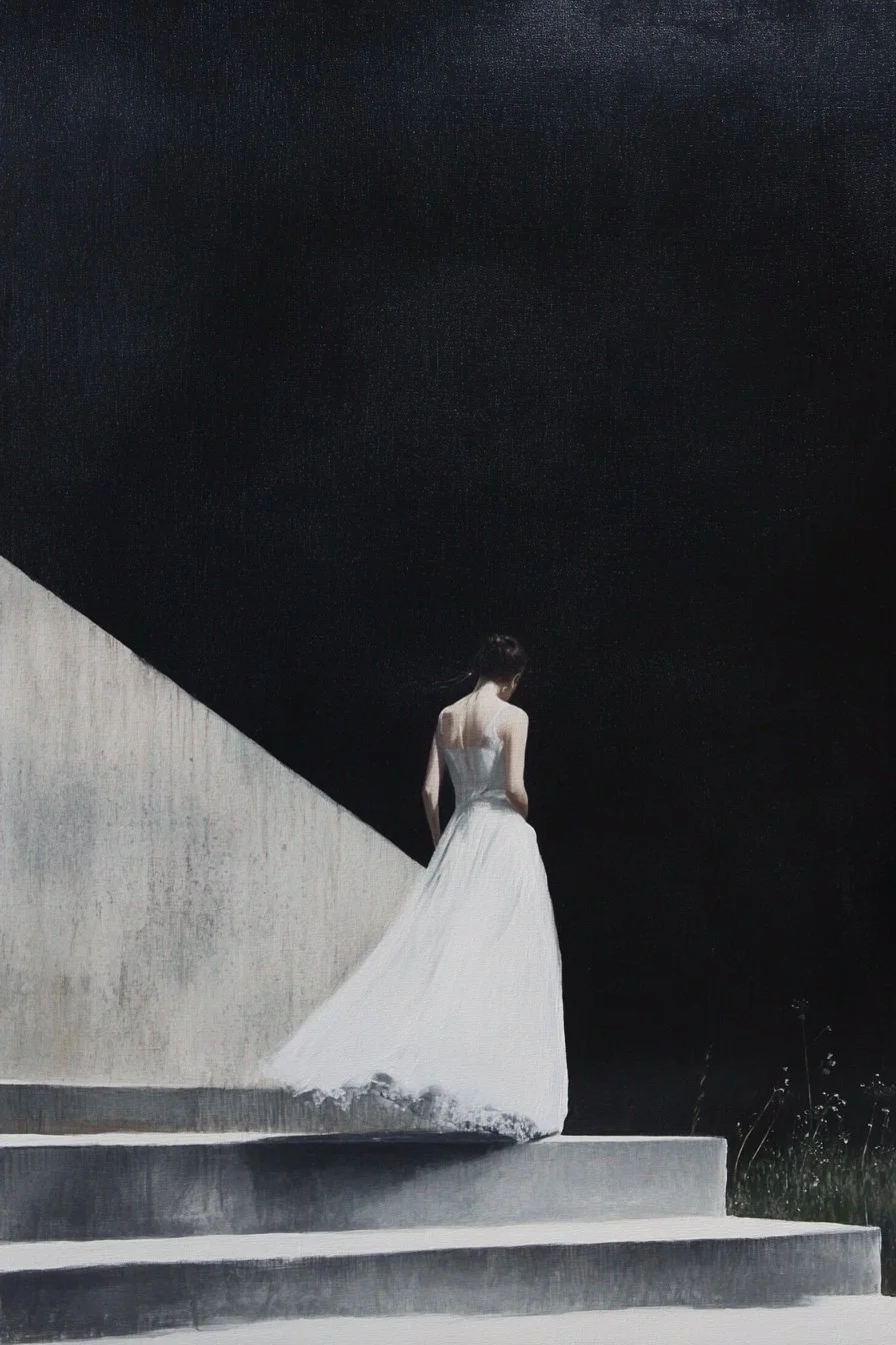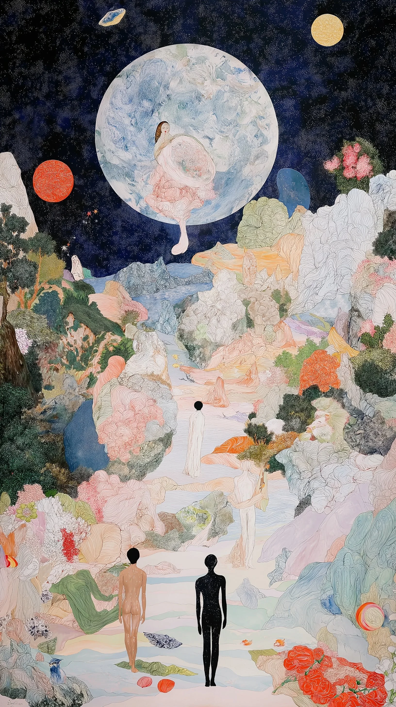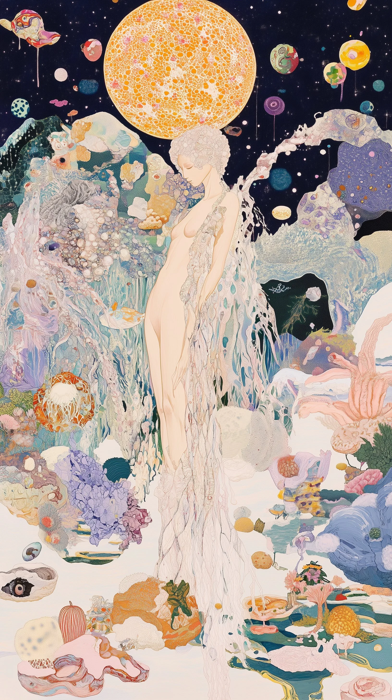 Her art is a fusion of surrealism, fantasy, and symbolic storytelling, marked by dreamlike compositions, ethereal lighting, Japanese influence, and intricate detailing. She crafts otherworldly scenes, where figures seem to transcend time and space, evoking themes of journey, transformation, and cosmic rebirth. Her mastery of light and contrast creates an immersive, almost mystical atmosphere, with her signature elongated portrait compositions adding to the elegance of her visual storytelling. With textures that feel fluid and organic, celestial elements, and striking color palettes, her work invites the viewer into a realm both tactile and metaphysical—a balance of reality and dream, where each piece tells a story of mystery, contemplation, and the sublime.