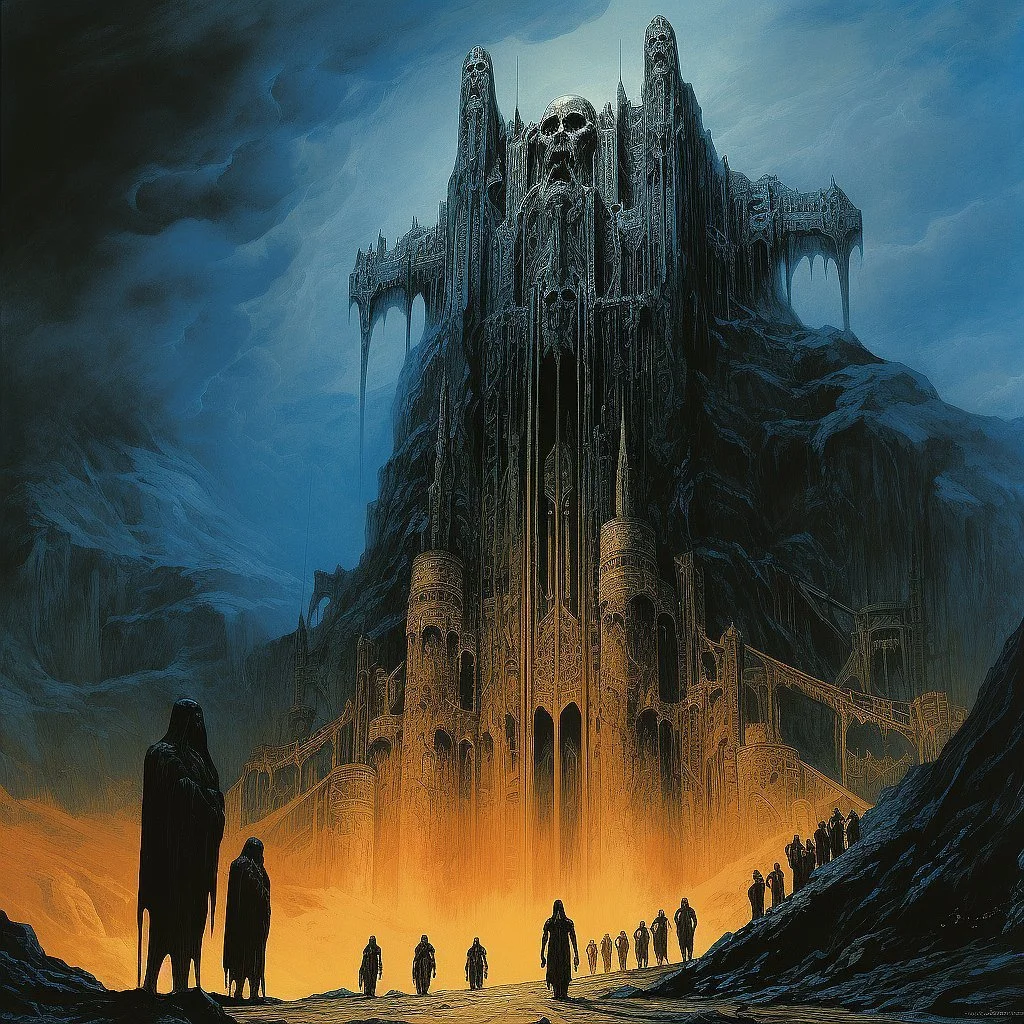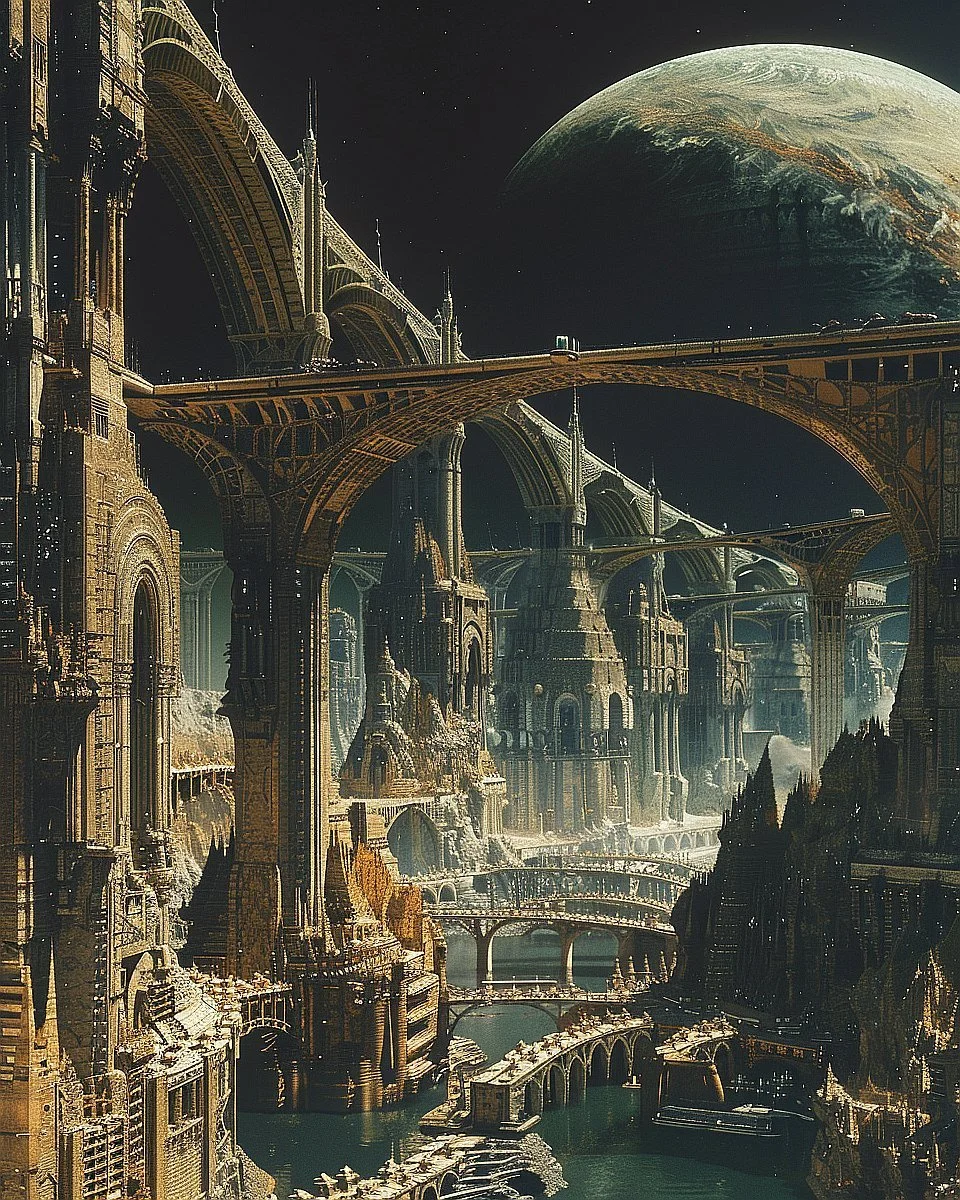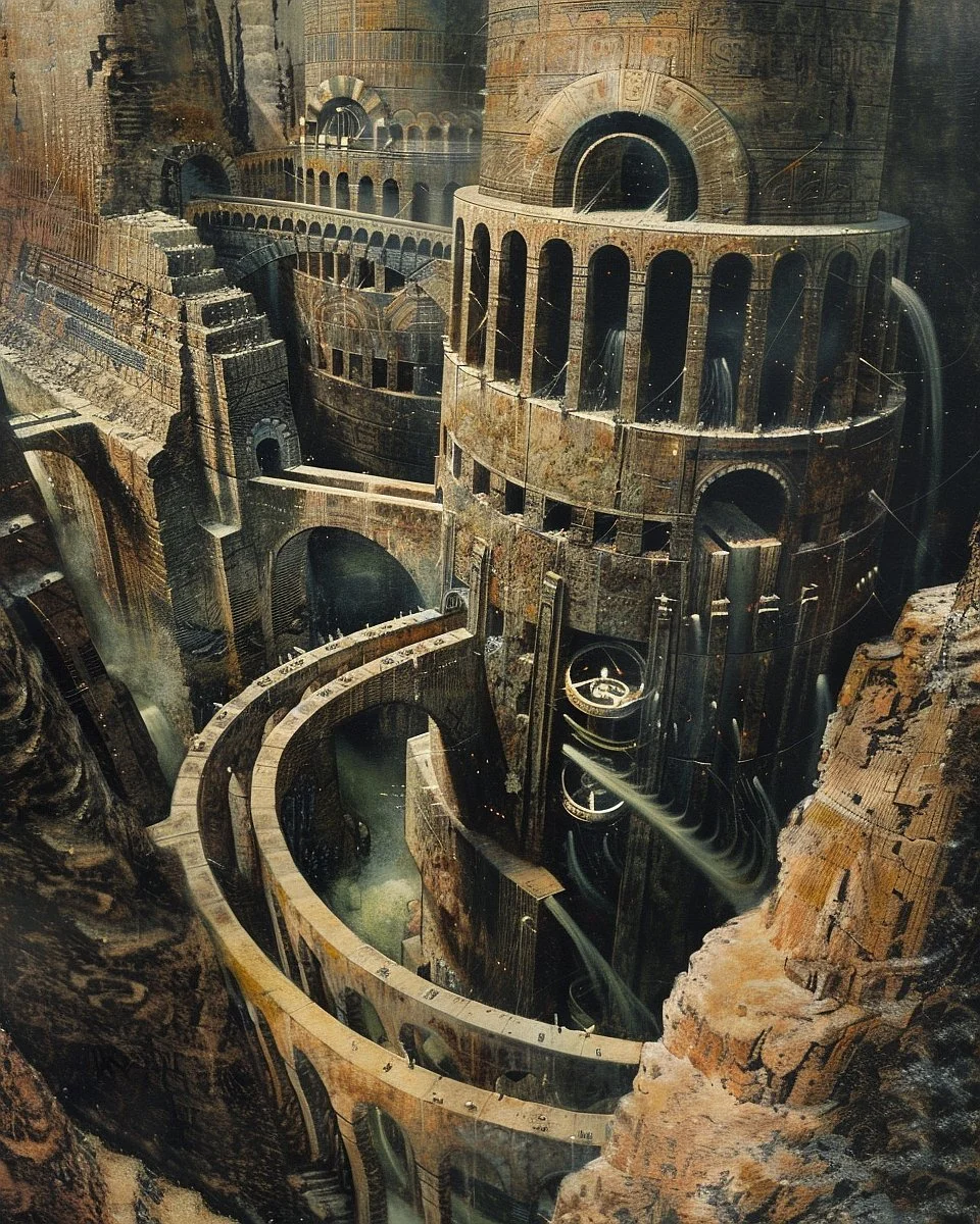 In many of Piotr's works, humanoid figures—often dwarfed by the colossal scale of their surroundings—add a compelling narrative element (a technique I also like to use in my own art). These tiny characters, set against the grandeur of his architectural wonders, emphasize the vastness and mystery of his imagined worlds.