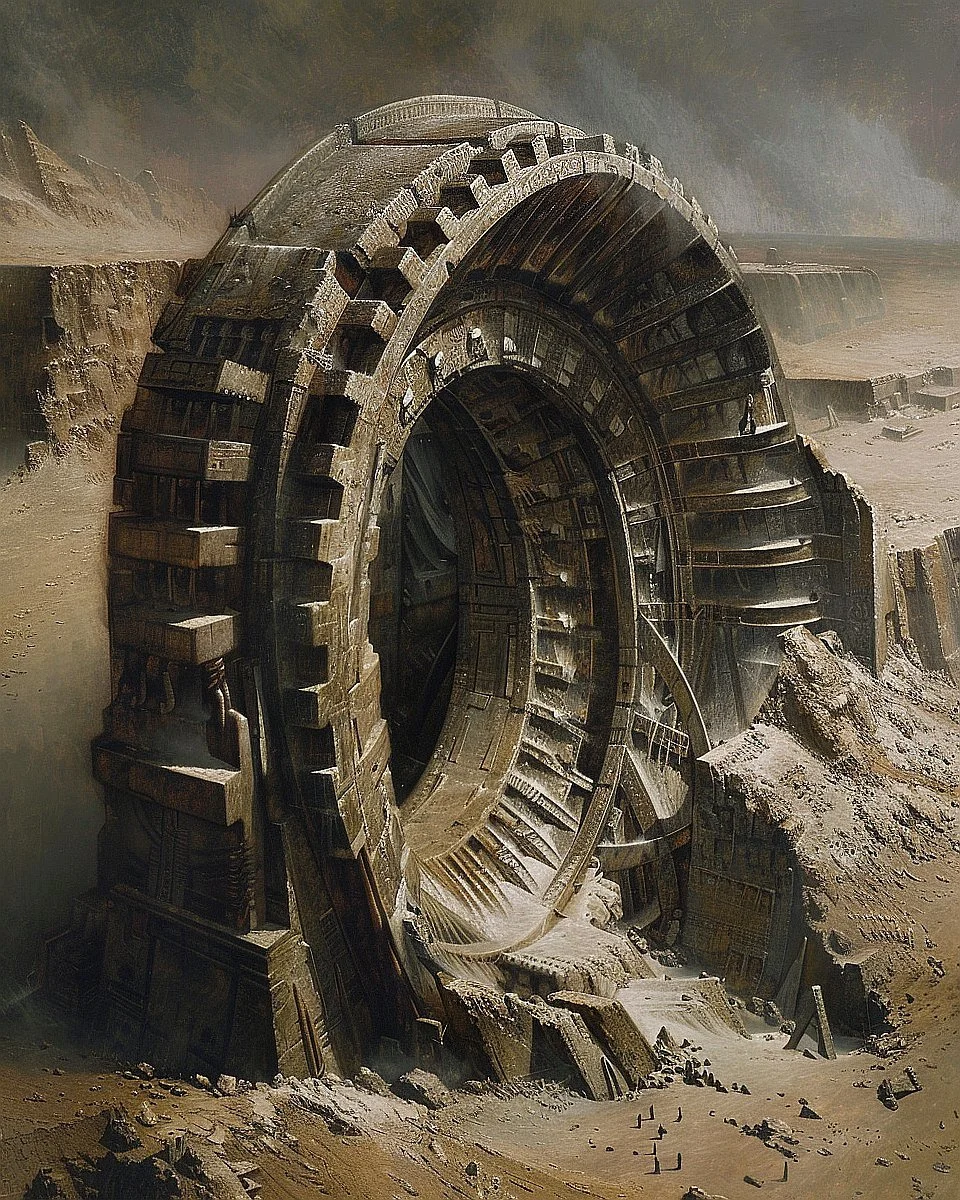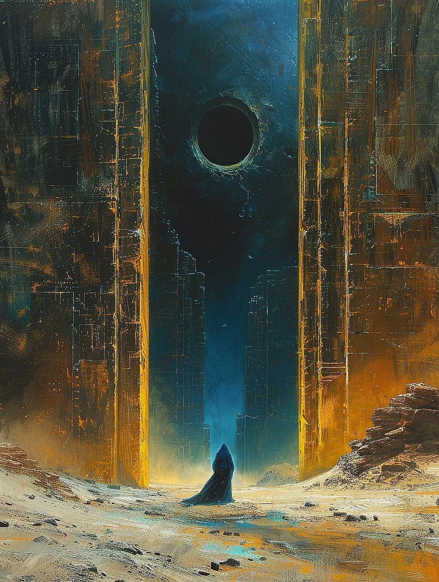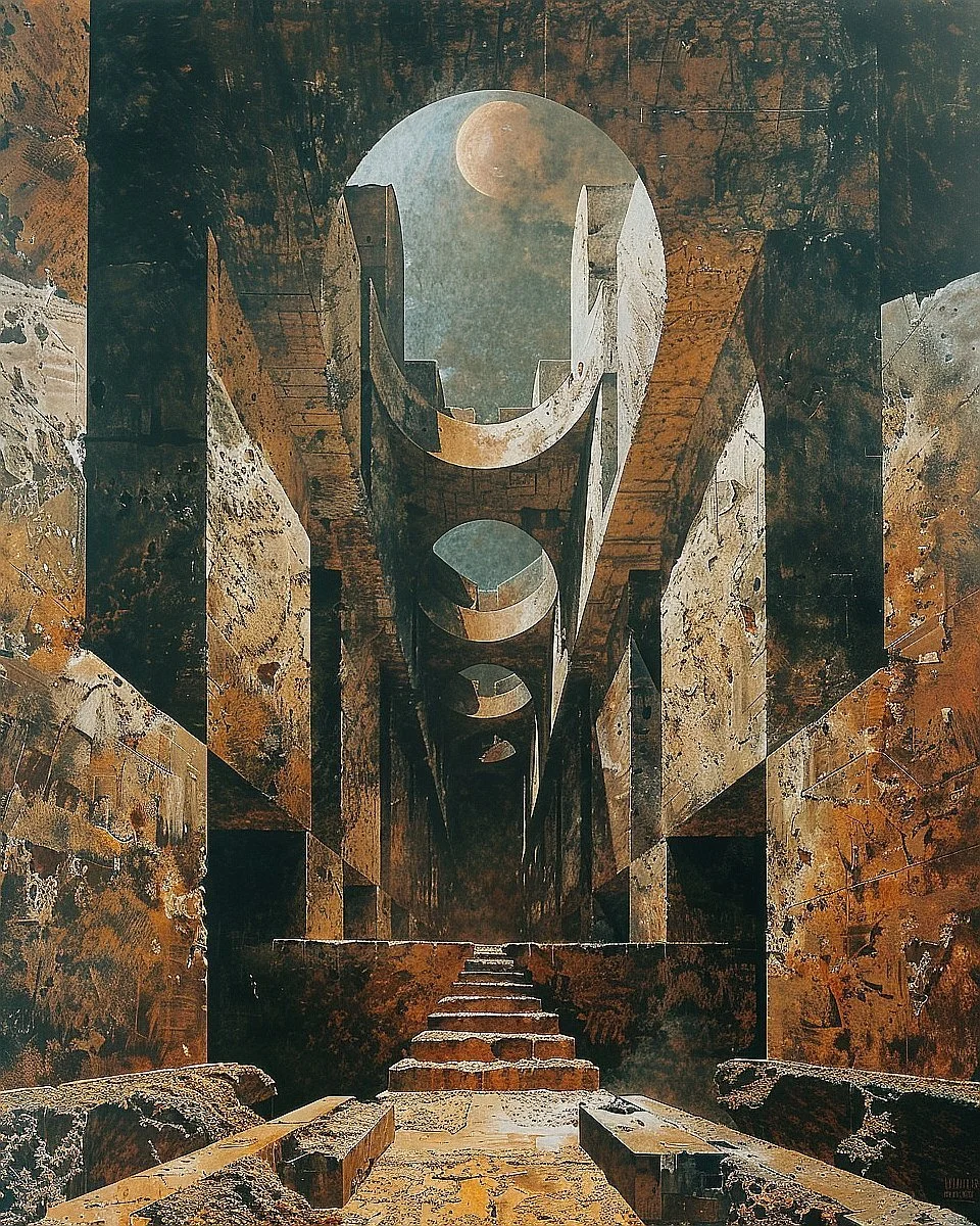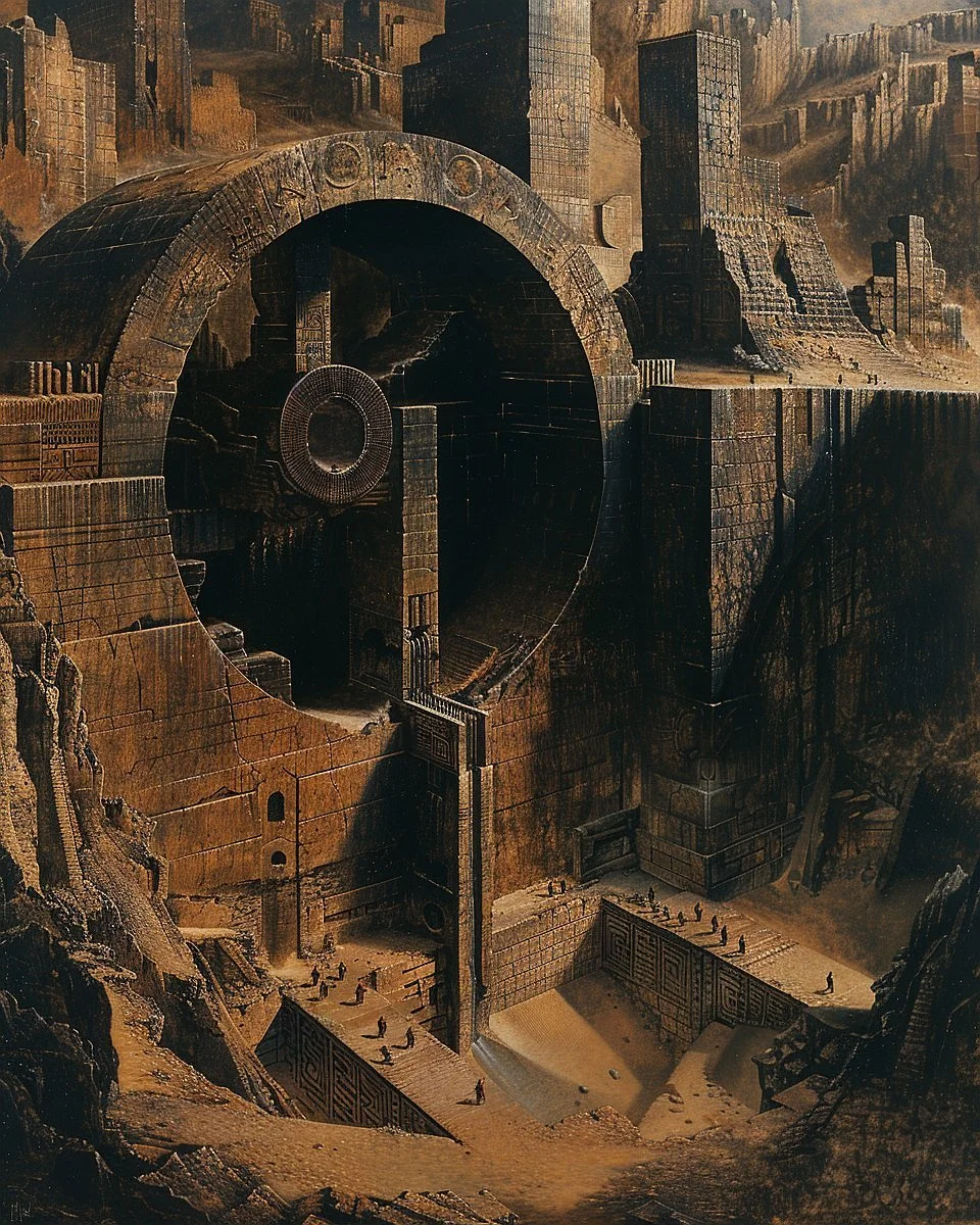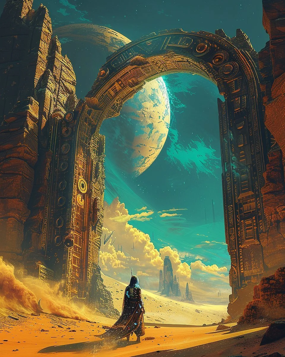 I immediately loved the style of Piotr Binkowski, a remarkable AI artist from Poland who consistently generates stunning art. Each piece invites viewers into a world where imagination soars, often depicting massive buildings, circular and likely magical portals, mysterious gateways, and futuristic or ancient alien structures.